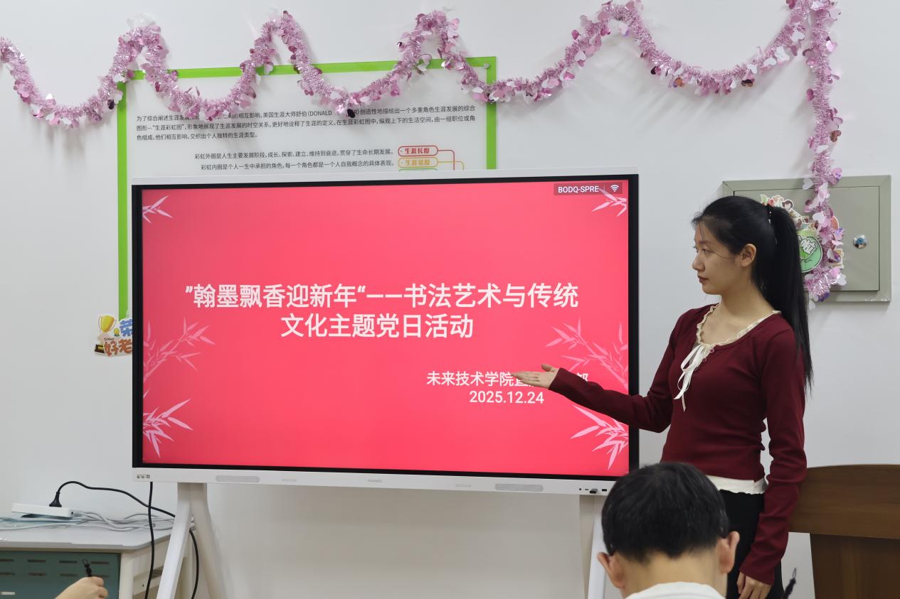 为弘扬中华优秀传统文化,丰富组织生活形式,提升党员的文化素养与精神风貌,2025年12月24日,未来技术学院直属党支部在未来楼202教室举办“翰墨飘香迎新年”书法艺术与传统文化主题党日活动。支部党员及入党积极分子齐聚一堂,在笔墨书香中感悟文化魅力,锤炼党性修养。