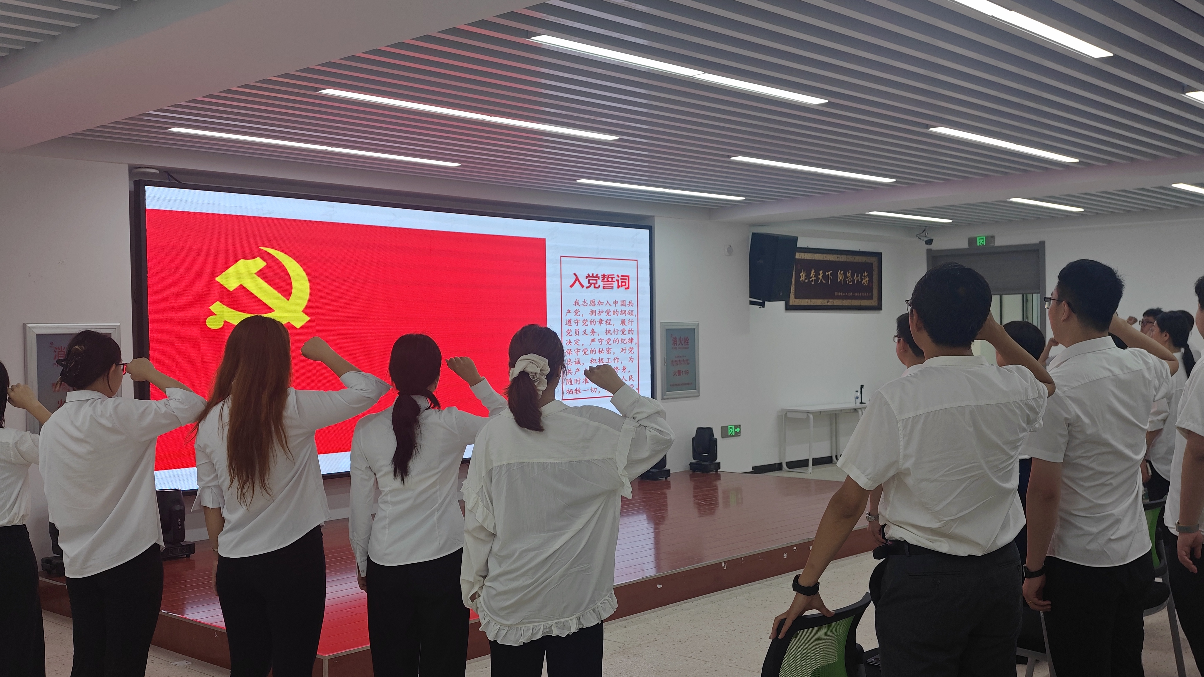 学院当天还举行了重温入党誓词活动。在庄严的党旗前,全体党员与学院新党员高举右拳,一同重温入党誓词。大家纷纷表示,要时刻牢记党员身份,在教学科研一线发挥先锋模范作用,为培养德艺双馨的设计人才贡献力量。