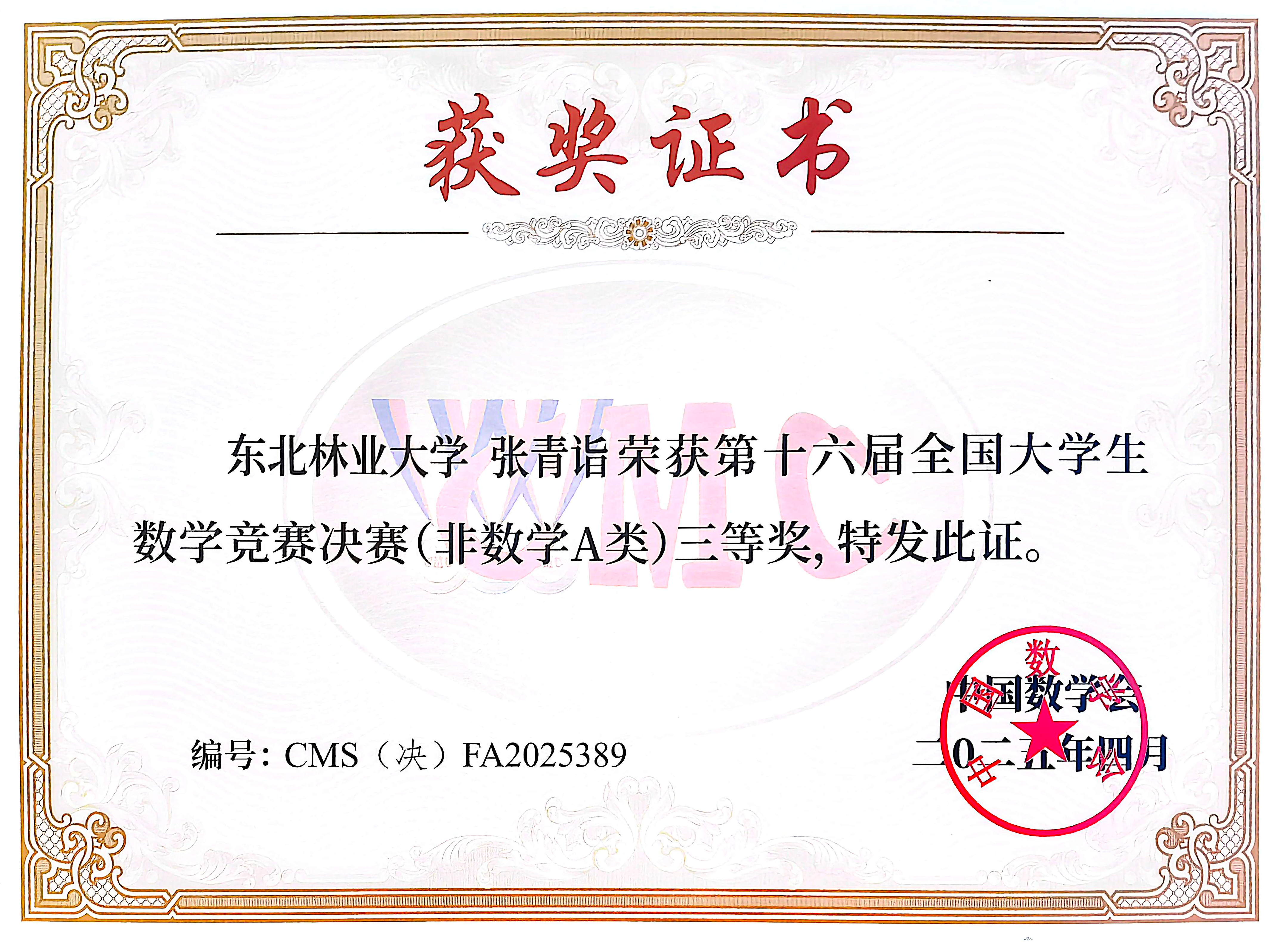 近年来,我校构建了 “以赛促学、教赛相长” 的林业院校数学基础课教学体系,以培养优秀人才为目标,持续深化课程改革,夯实学生数学基础;相关部门及各学院协同联动,形成强大育人合力。数学系组建竞赛指导教师团队,通过有序组织、专项培训、开设公选课程等方式为学生参赛提供专业指导,强化学生数学思维训练,为学生综合素质提升和核心竞争力增强提供坚实支撑。