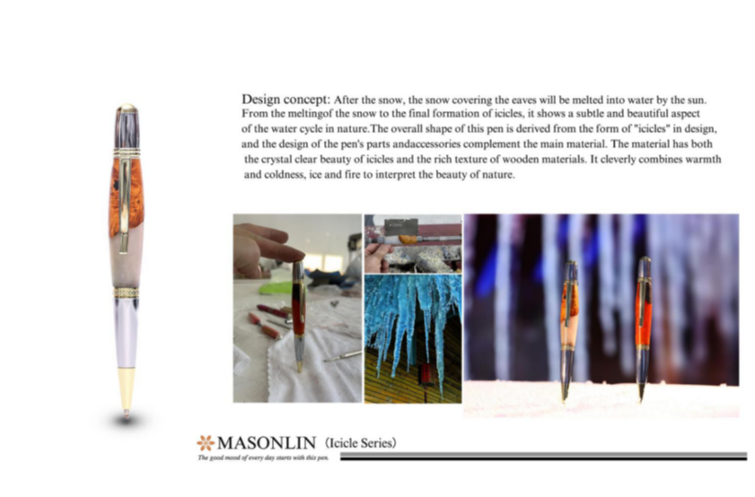 我校教师的手工笔作品《MASONLIN》是一系列纯手工打造的木制笔,由设计者手工制作而成,以哈尔滨独特的地域文化为载体展开的创意构想,通过对笔的造型与材料的设计,表达这座城市中不同的设计主题,来展现哈尔滨的冰雪文化、欧式建筑特征、丁香花之美以及哈尔滨的四季变化。意在以笔为载体,蕴城市之特色,展尔滨之风采。