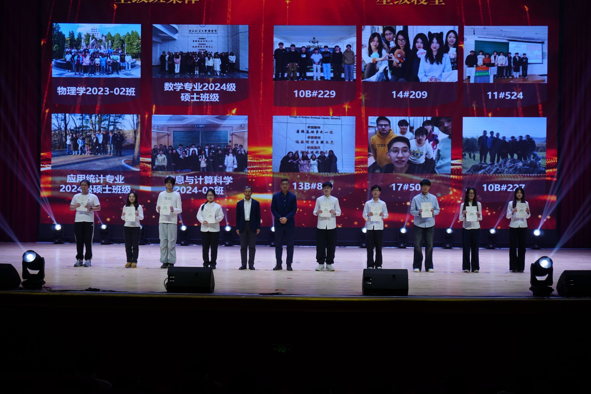颁奖环节,学院对荣获“学习之星”等“理学之星”系列奖项的学生先进个人,以及星级班集体、星级寝室进行了集中表彰,生动展现了学院全方位育人的丰硕成果。副院长崔金刚、丁亮为获奖代表颁发证书,激励全院学子以先进为标杆,砥砺前行。在教师表彰环节,学院对马晓剑、丁宇婷等九位“党员先锋岗”教师,以及谭畅、曹连英等七位“十四五”期间教学、科研业绩突出的教师予以隆重表彰,学院党委书记李玉荣为获奖教师授予鲜花。
