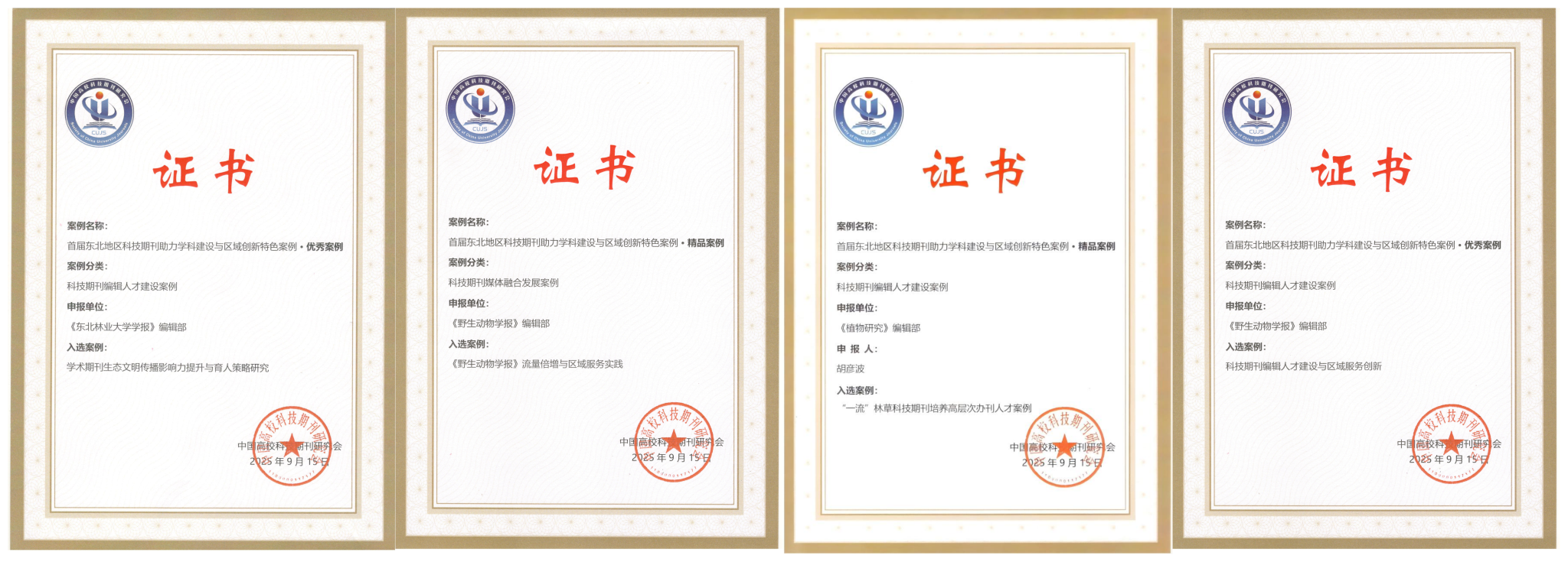 2025年9月15—18日,“首届东北地区科技期刊助力学科建设与区域创新研讨会”在辽宁沈阳东北大学举办。会上发布了“首届东北地区科技期刊助力学科建设与区域创新特色案例征集活动”入选案例,我校《东北林业大学学报》申报的“学术期刊生态文明传播影响力提升与育人策略研究”案例入选优秀案例;《野生动物学报》申报的“《野生动物学报》流量倍增与区域服务实践”案例入选精品案例;《植物研究》胡彦波副编审申报的“‘一流’林草科技期刊培养高层次办刊人才”案例入选精品案例;《野生动物学报》申报的“科技期刊编辑人才建设与区域服务创新”案例入选优秀案例。