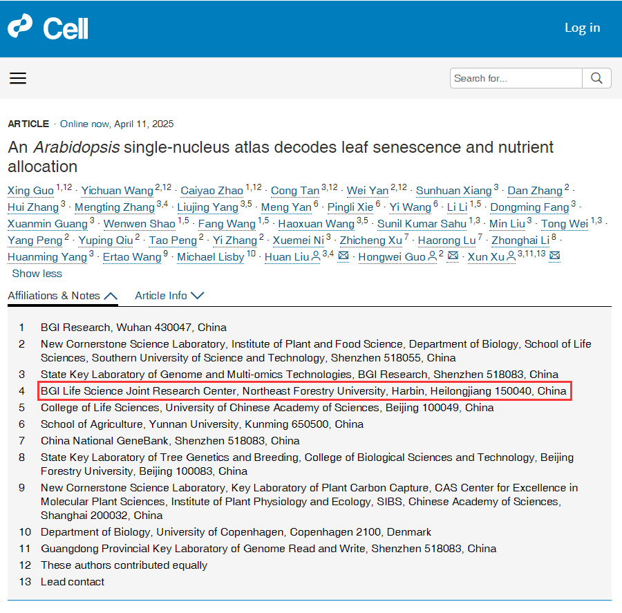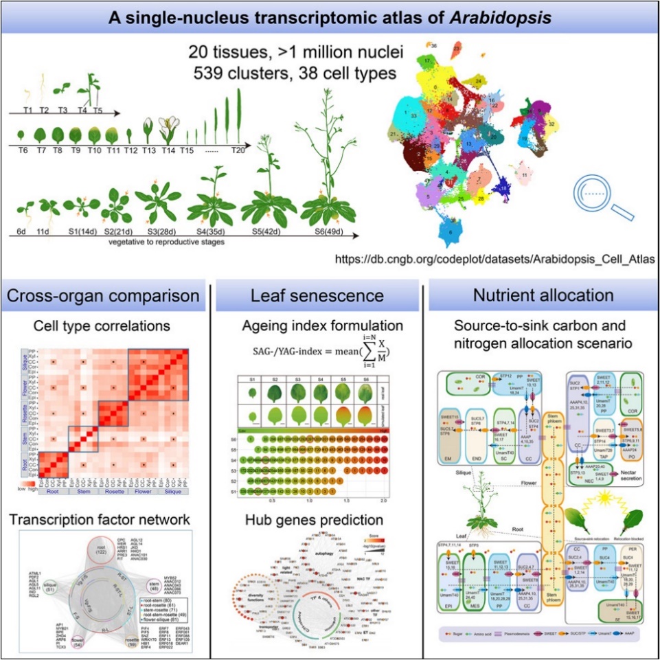 4月11日,我校客座教授、“东林-华大生命科学联合研究中心”刘欢研究员团队,与武汉华大生命科学研究院、南方科技大学等单位合作,在顶级学术期刊细胞(Cell)杂志在线发表了题为An Arabidopsis single-nucleus atlas decodes leaf senescence and nutrient allocation的研究论文。该论文构建了模式生物拟南芥全生命周期单细胞转录组图谱,并创新性地从单细胞水平上解析了叶片衰老进程,描绘了碳/氮的源库转运图景。