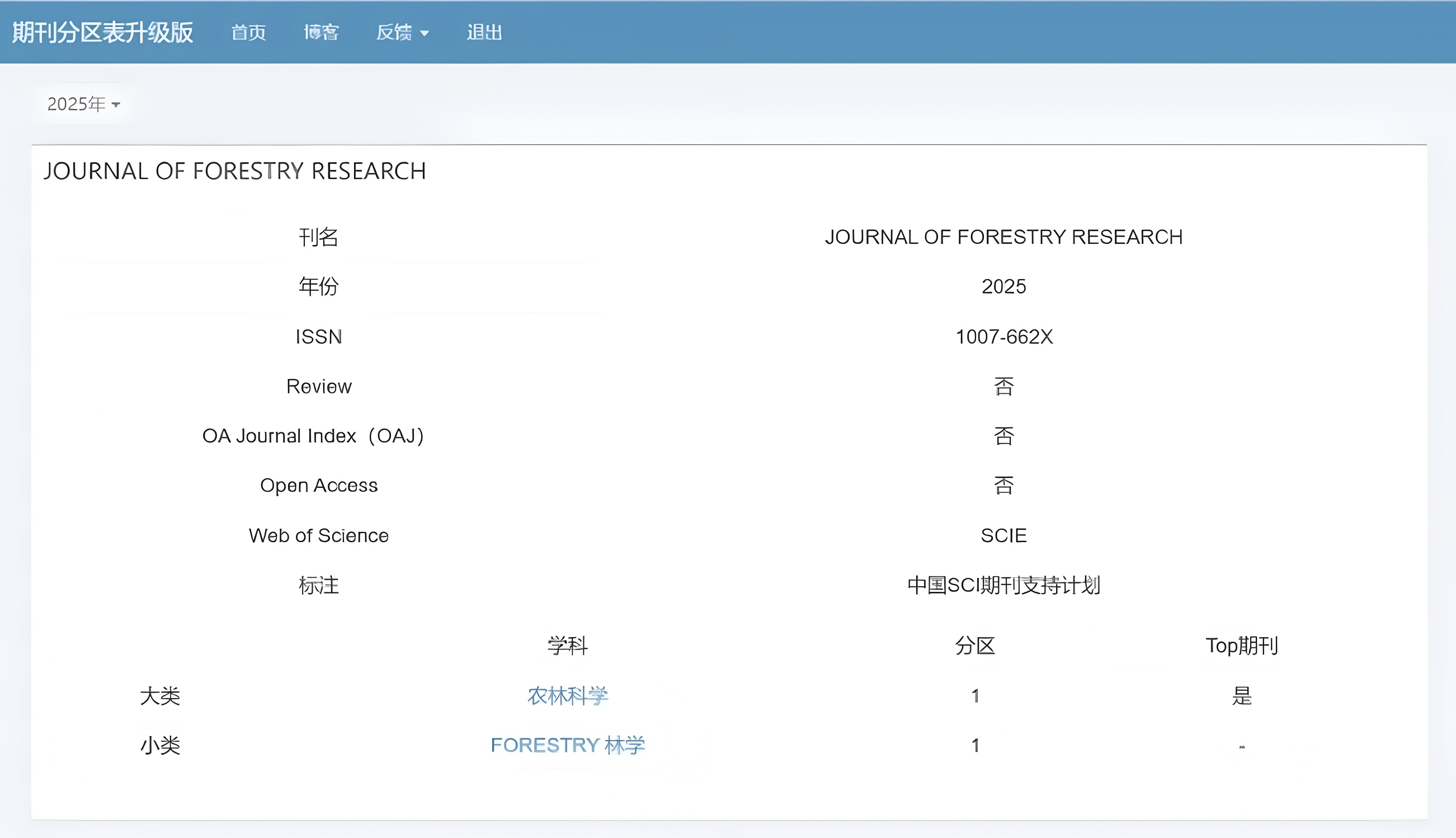 3月20日,中国科学院文献情报中心正式发布《2025年中国科学院文献情报中心期刊分区表》,东北林业大学英文学术期刊《林业研究(英文)》(Journal of Forestry Research)取得历史性突破,位列中科院一区、Top期刊!