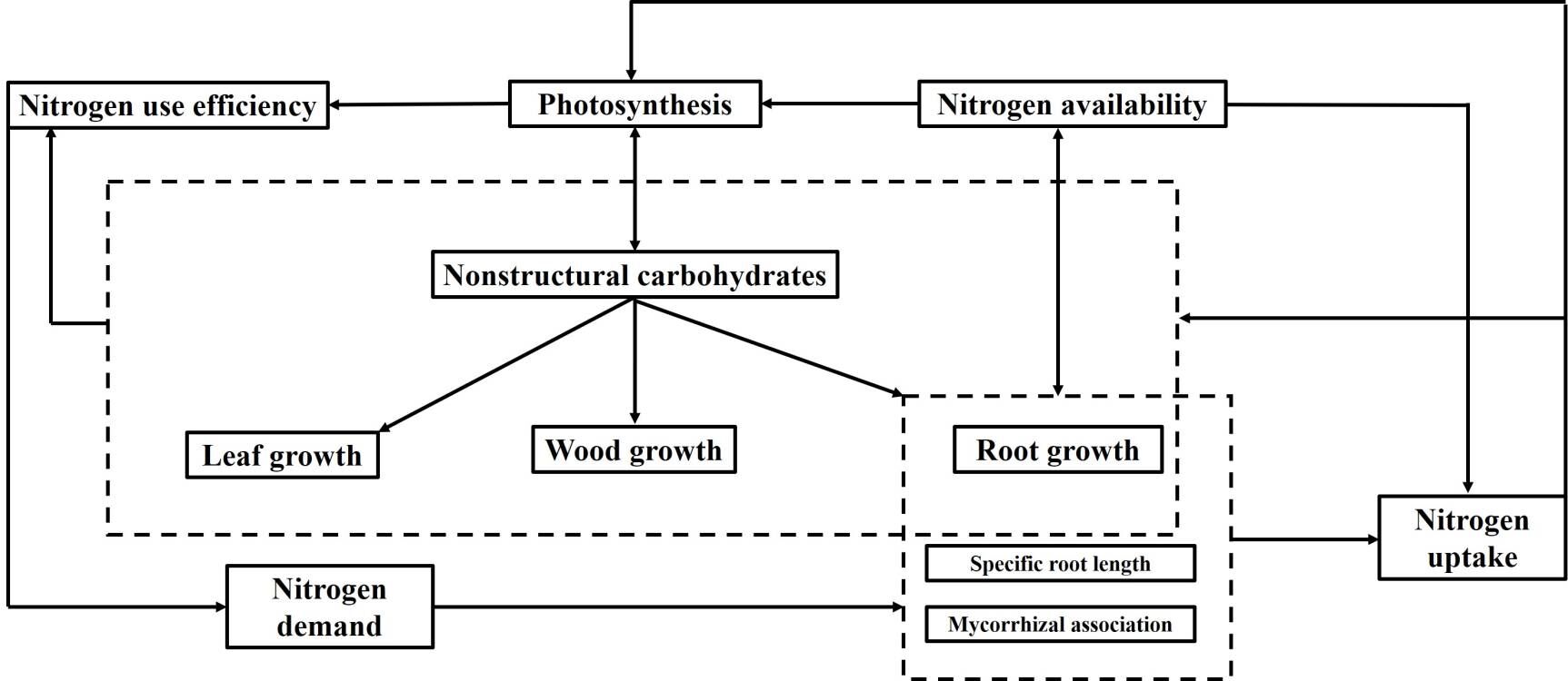 为揭示树木“CO2施肥”的氮介导效应大小及其作用机理,该团队整合全世界283个CO2浓度升高控制试验发现:CO2浓度升高,增加树木生物量生产达32%,同时导致非结构性碳水化合物在叶片中积累,但在枝干和根中没有显著变化;这表明树木生长在一定程度上受碳限制,但受限程度与树木不同组织对碳需求的强弱有关。氮添加使树木生长的“CO2施肥效应”提升68%,表明CO2浓度升高可促进树木生长对氮的需求。而在没有氮添加的情况下,CO2浓度升高一方面可以通过增加细根生物量生产、降低比根长等,增加树木的氮吸收;另一方面通过提高树木组织的碳氮比,提升树木的氮利用效率,从而缓解树木的氮限制,进而维持树木生长的“CO2施肥”正效应。该研究还发现:树种种类及其共生菌根类型会影响树木生长的“CO2施肥”效应的大小,其中,CO2浓度升高对外生菌根树种和针叶树的“施肥效应”分别比对丛枝菌根树种和被子植物更加明显;产生的这些差异与外生菌根和针叶树种具有更高的氮吸收和氮利用效率有关。