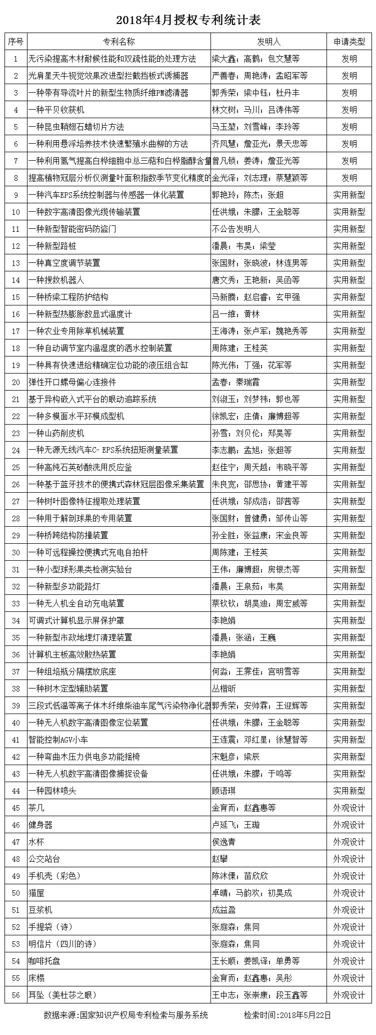 根据国家知识产权局专利检索与服务系统(www.pss_system.gov.cn)的统计数据,2018年4月,我校师生获得专利授权56项,发明授权8项,实用新型授权36项,外观设计授权12项。