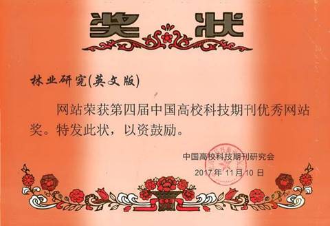 《林业研究》(英文版)连续4年(2014-2017)获评“中国最具国际影响力学术期刊”。“中国最具国际影响力学术期刊”是由中国学术期刊(光盘版)电子杂志社根据“期刊国际影响力指数”高低对我国3500种科技期刊进行评价,遴选出2017年“中国最具国际影响力学术期刊”175种(TOP5%)。