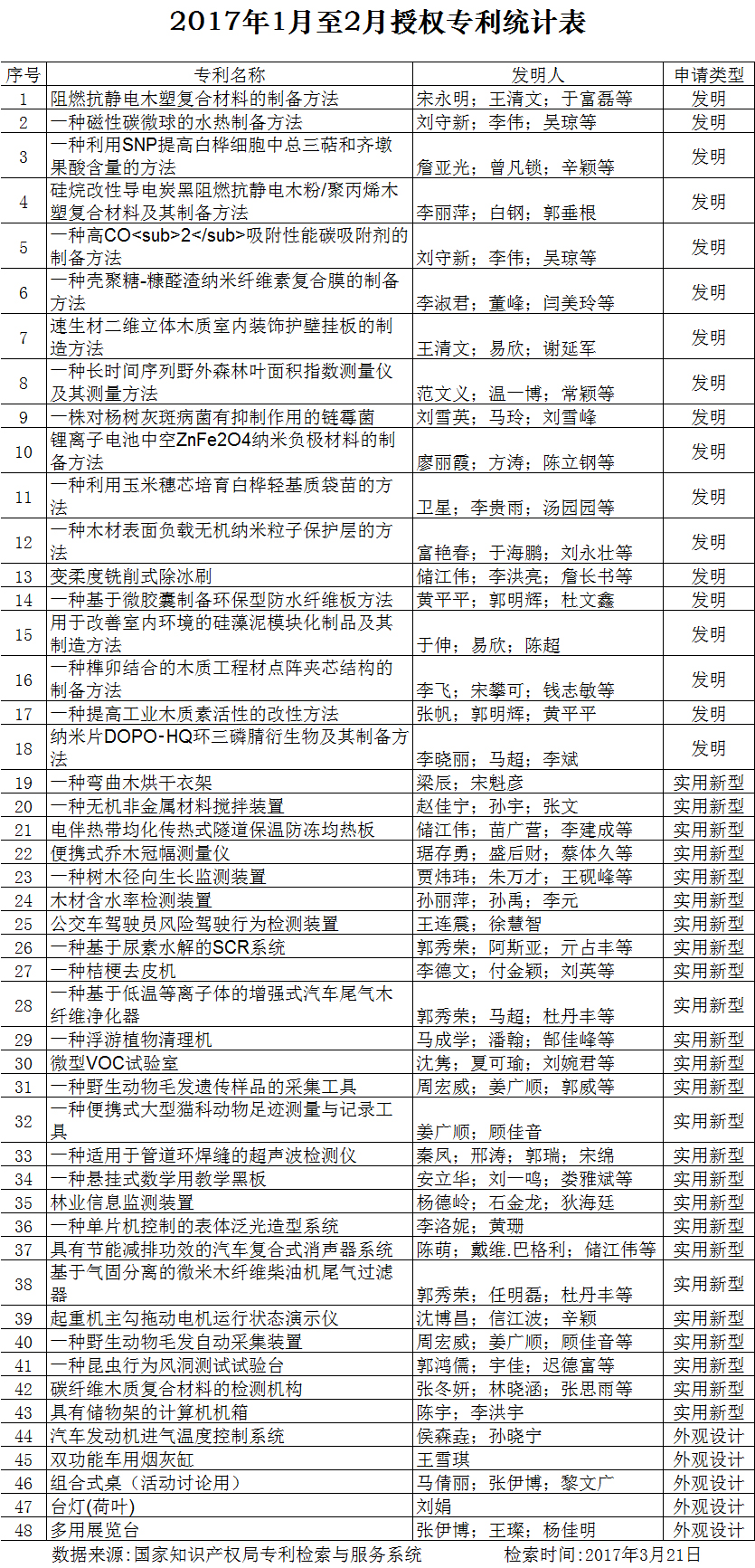 根据国家知识产权局专利检索与服务系统(www.pss_system.gov.cn)的统计数据,2017年1月至2月,我校师生获得专利授权48项,其中发明专利18项、实用新型专利25项、外观设计专利5项。