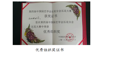 在本次活动中,我校首次尝试以学生独立完成的压花作品送选国赛。由于参与创作的学生大多为压花艺术的初学者,园林学院为保障作品质量,在倡导原创性和学生主体性的同时,积极组织相关老师进行赛前辅导,并与黑龙江省林学会插花花艺研究会共同主办了“第一届黑龙江省压花艺术大赛”,为参加国赛进行作品选拔。学生们也身肩使命,积极配合,利用了大量的课余时间进行压花画的研习和实践,在老师的指导和鼓励下大胆创新材质、创新画风,最终创作出主题新颖、形式多样、内容丰富的压花艺术作品,不但在“第一届黑龙江省压花艺术大赛”中取得了优异成绩,而且有15件压花作品获得了国赛参选资格,使我校成为参赛单位中的佼佼者,为学校赢得了“优秀组织奖”的集体荣誉。