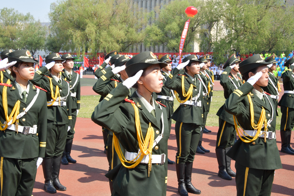 开幕式检阅中,庄重威严的国旗仪仗队、英姿飒爽的刀旗队、青春洋溢的花束队以及参加比赛的24支代表队,穿着整齐的服装,喊着嘹亮的口号,迈着矫健的步伐依次走过主席台,接受学校领导和师生的检阅。