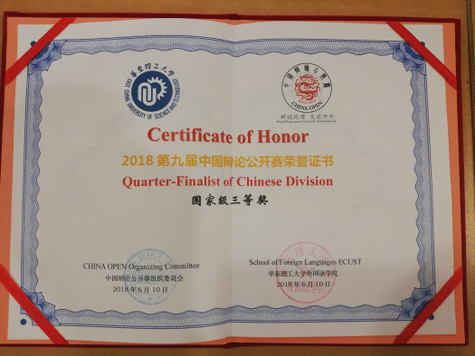 6月8日至11日,第九届中国辩论公开赛(China Open)在华东理工大学举行,我校由文法学院兰晓宇、刘永鸣、李汪钖、朱伯志、刘鑫琦、李震、冯媛、廖志8名学生组成的东北林业大学代表队,与来自美国威拉姆特大学、香港中文大学、复旦大学、武汉大学、四川大学等48所高校的141支队伍同场竞技,经过激烈角逐,东北林业大学代表队晋级四分之一决赛,最终荣获全国三等奖!