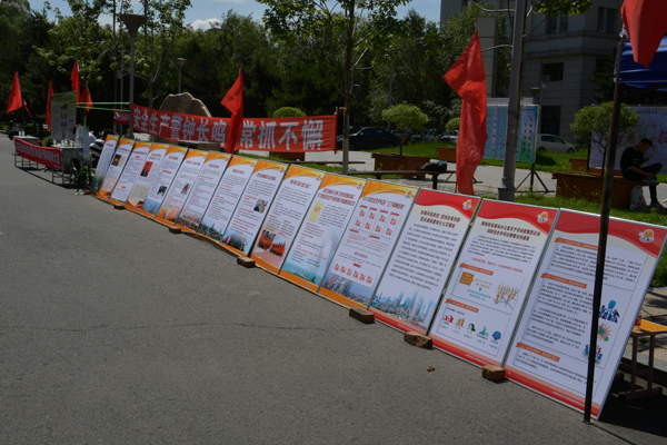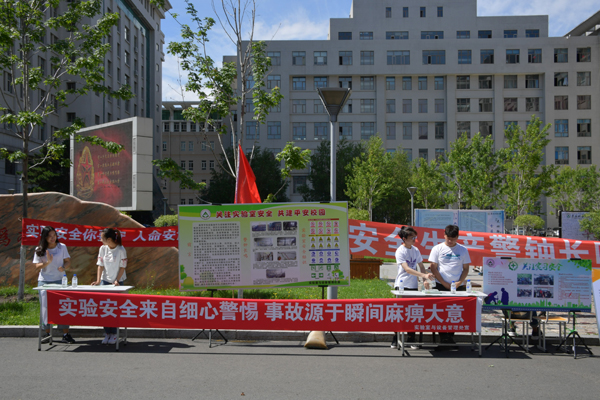 在活动现场悬挂着一些安全宣传条幅,“交通安全知识图文”“人身安全知识图文”“消防安全知识图文”“自然灾害及减灾知识图文”“实验室安全知识图文”“公共卫生安全”等展板,向全校师生介绍安全知识。现场播放的“交通安全”“消防安全”相关内容的教育短片,警示师生要时刻树立安全意识,现场设置了咨询台,向广大师生员工发放安全知识宣传单,传播学校安全生产常识、理念和行为规范,普及安全知识和安全防护技能。