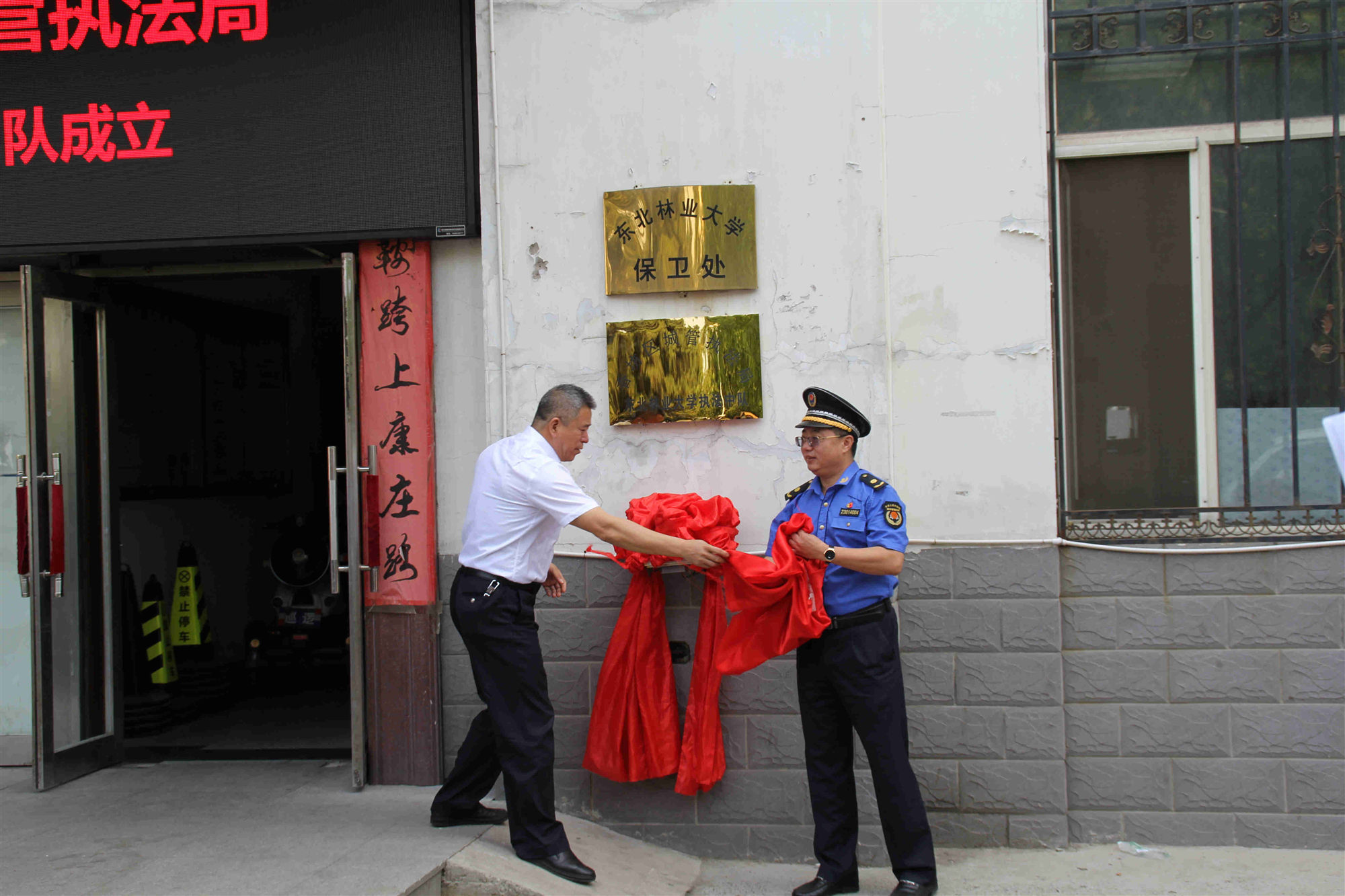 为建立校园及周边环境整治的长效机制,建设保持良好的校容校貌,6月19日上午,哈尔滨市香坊区城管执法局东北林业大学执法中队在学校保卫处正式挂牌成立。保卫处处长丁胜利,副处长孙文震;香坊区城管执法局副局长郭瑞军,监察科科长纪海鹰及执法中队相关人员参加挂牌仪式。