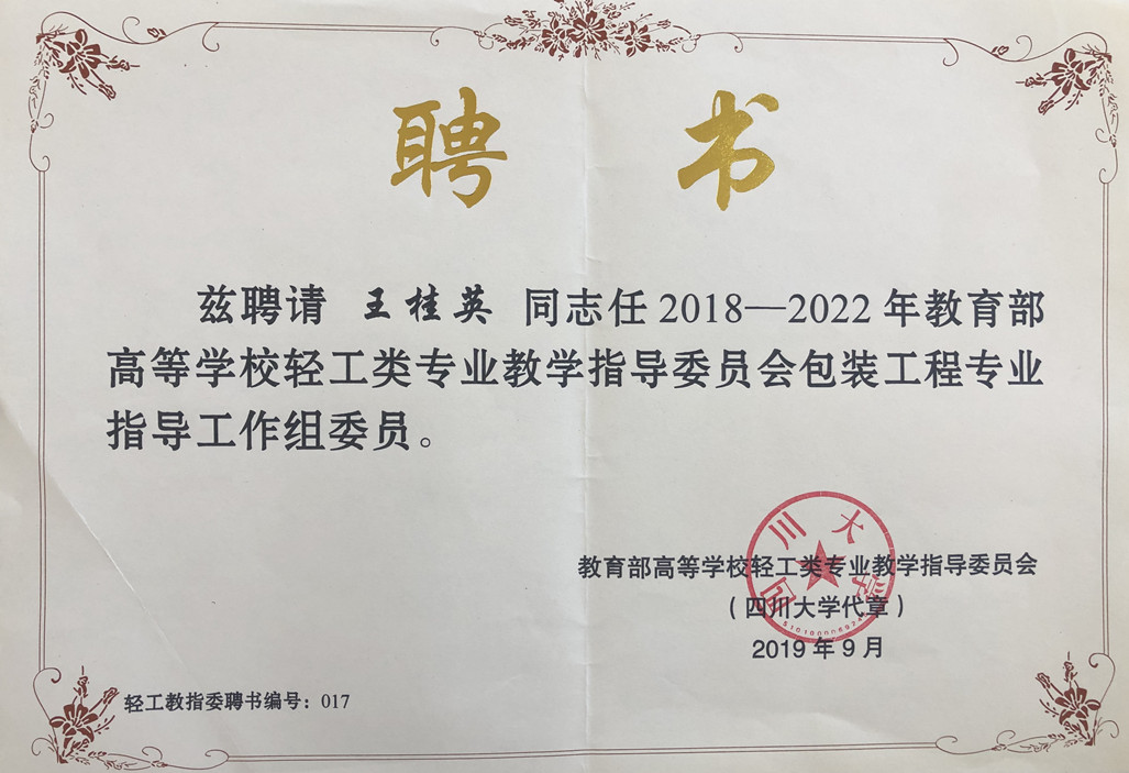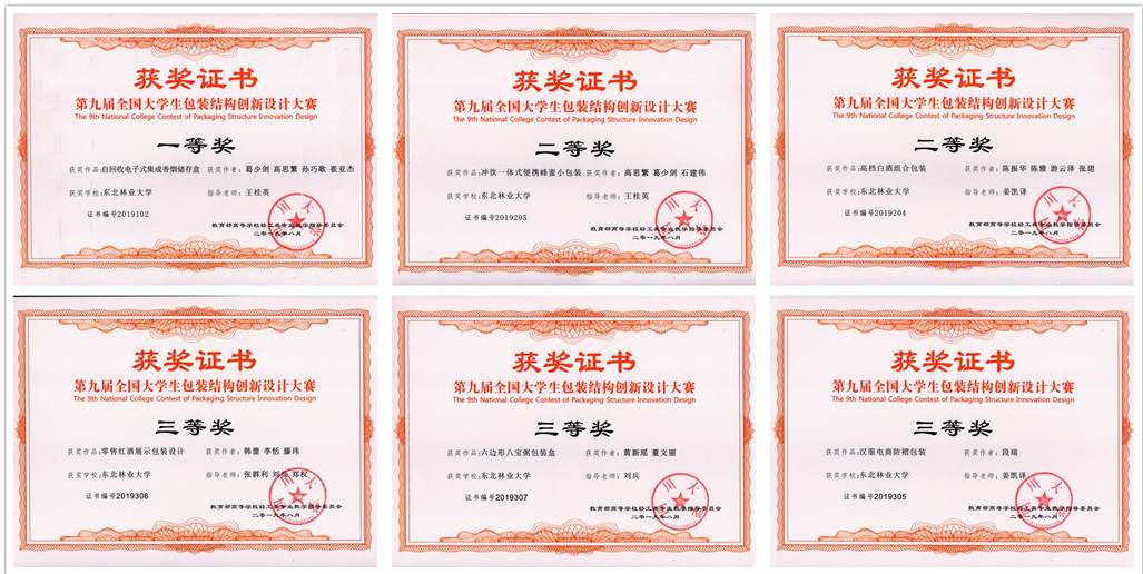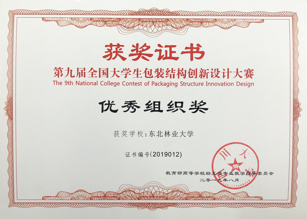 2019年9月21日至22日,由教育部高等学校轻工类专业教学指导委员会包装工程专业指导组主办的2019年年会及第九届全国大学生包装结构创新设计大赛颁奖典礼在江苏省无锡市江南大学举行。我校工程技术学院包装工程系主任王桂英被教育部高等学校轻工类专业教学指导委员会聘为2018-2020年教育部高等学校轻工类专业教学指导委员会包装工程专业指导组委员。在比赛中,我校参赛作品取得优异成绩,荣获国家一等奖1项、二等奖2项、三等奖3项,东北林业大学荣获最佳组织奖。