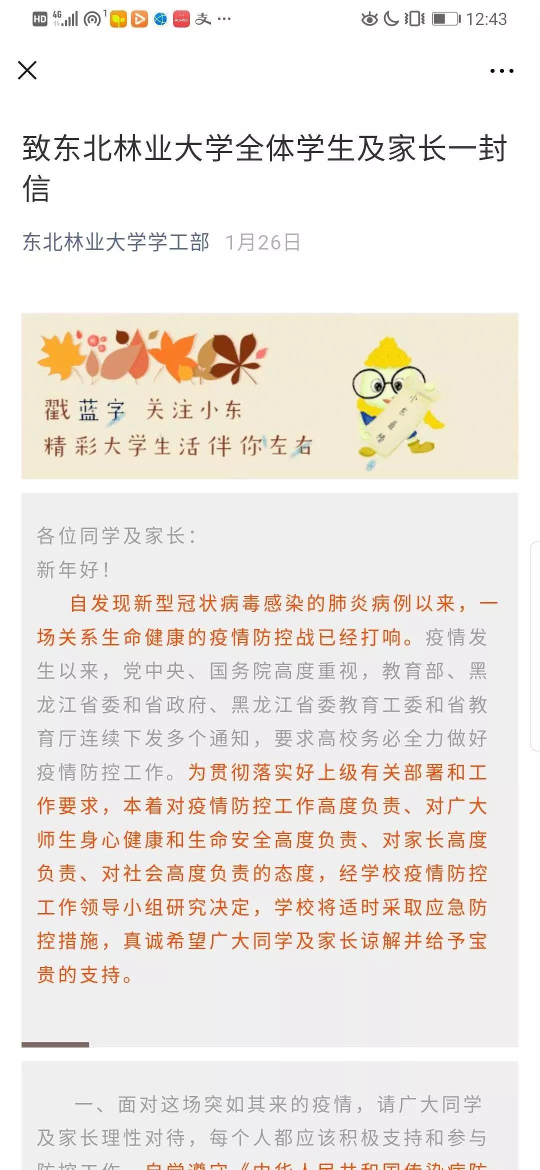 党委学工部发布《致东北林业大学全体学生和家长的一封信》