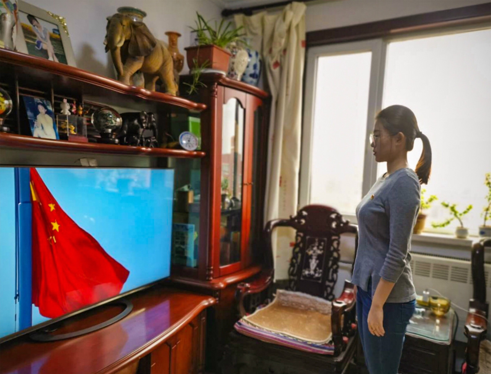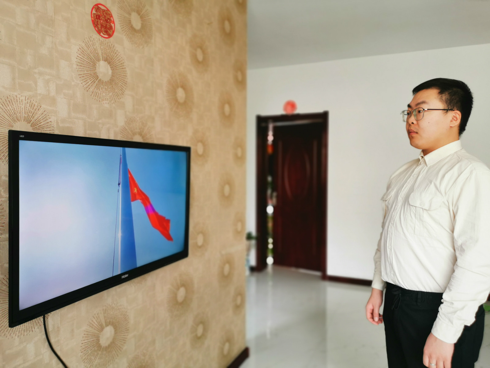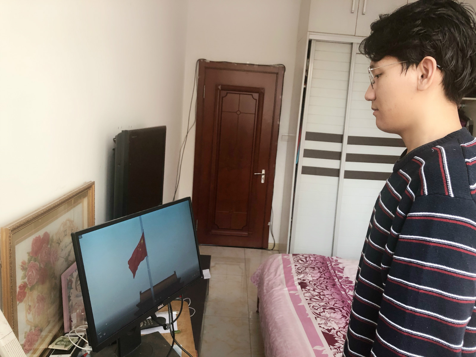 “请所有同学起立,行注目礼,奏唱国歌。”随着主持人铿锵的话语,屏幕前的全体师生身姿挺拔,神情庄严,面向屏幕中缓缓升起的五星红旗,高声跟唱国歌。