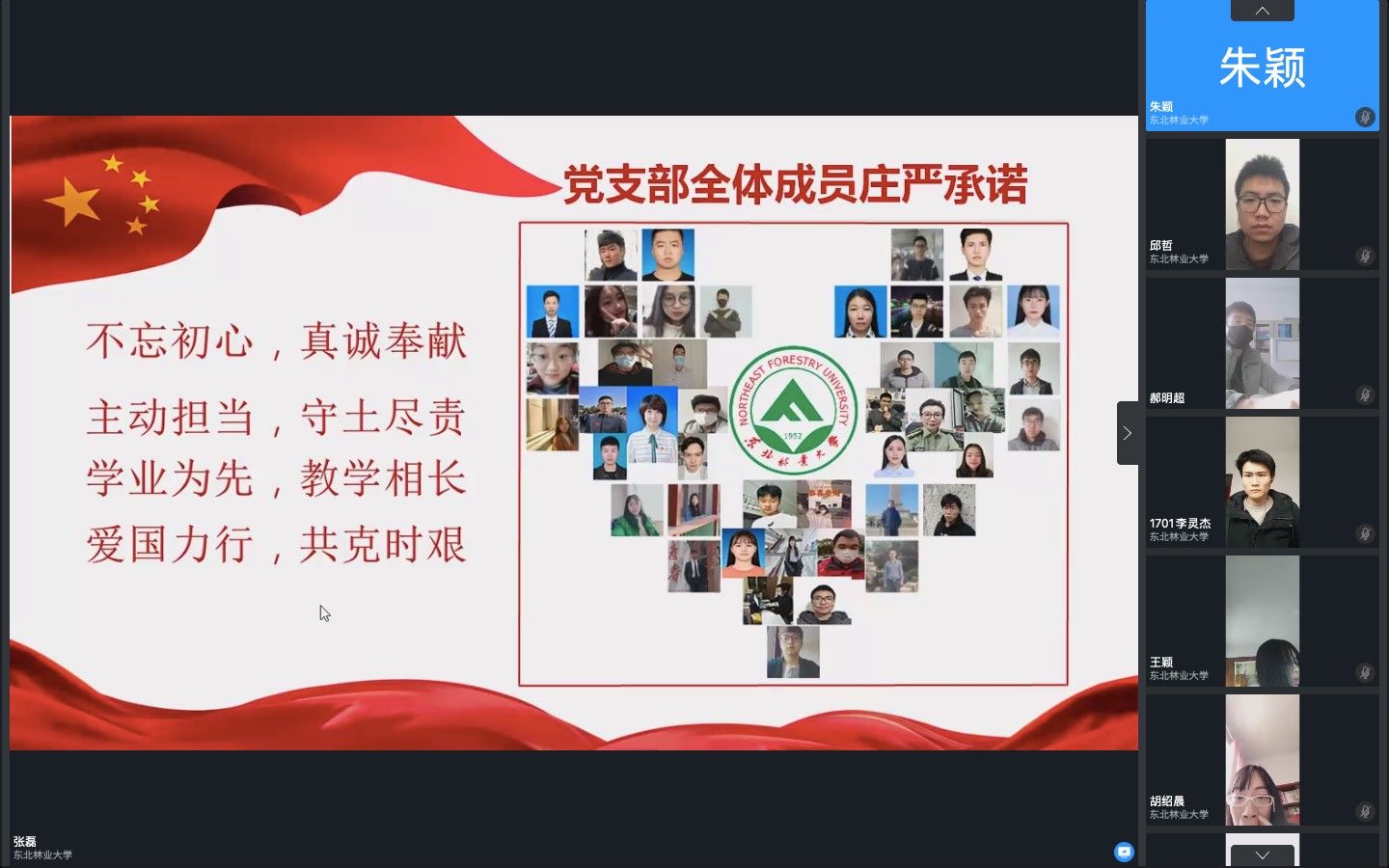 参会师生畅所欲言,就疫情防控期间的所闻所感进行了深入交流。大家分享了自己在家的学习、生活情况及面临的困难,很多同学的亲属都参与一线的防疫工作,有的同学直接投入防疫志愿服务,大部分同学都已经做好了详尽的学习科研准备。大家纷纷表示一定会科学理性看待疫情、服从防疫大局,守初心、担使命,积极发挥党员作用,离校不离学,以矢志向前的精神迎接抗疫的最后胜利。