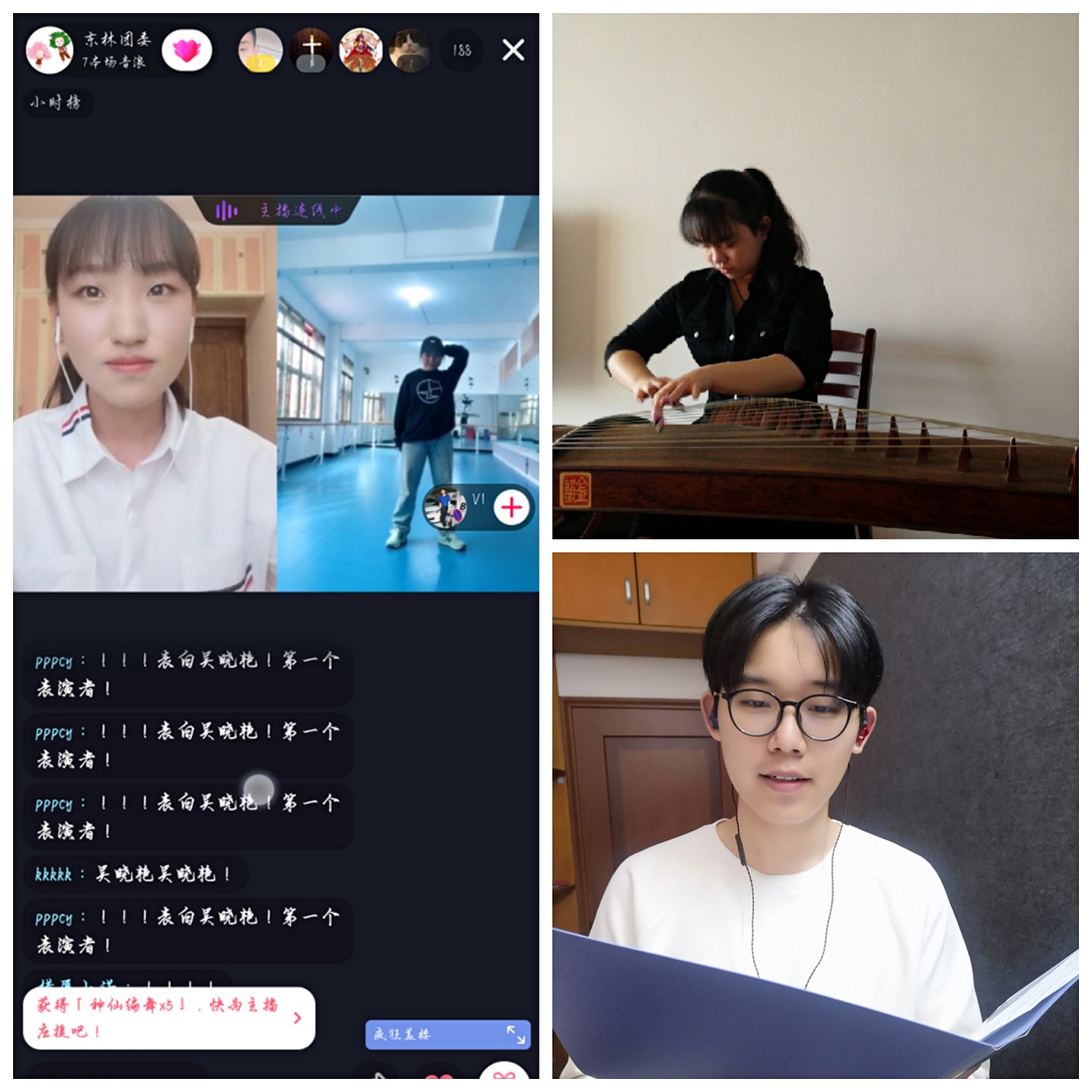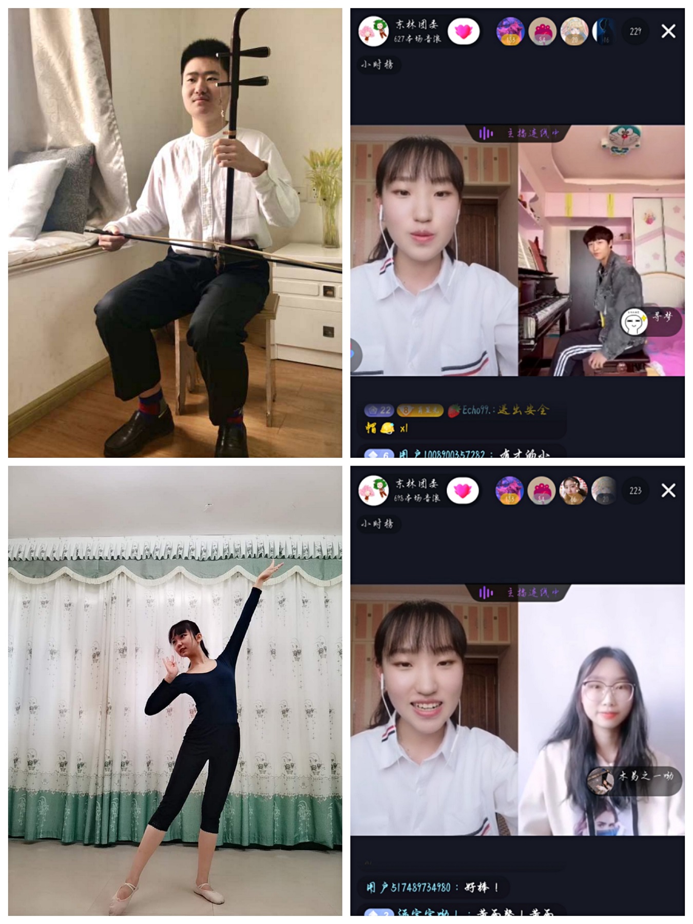 随后一组歌曲联唱引来大家纷纷点赞,轻快悠扬的《彩虹》、优雅美妙的《多远都要在一起》、坚定有力的《少年》,充分展现着青春的姿态与蓬勃的活力。二胡独奏《光明行》铿锵明快的旋律给人以信心和力量;具有英雄气魄的钢琴曲《革命》抒发了对祖国浓厚的热爱;中国舞《清风徐来》以优雅的旋律、柔美的舞姿展现了音韵和谐的真切之美。由我校学生原创的抗疫歌曲《白衣》,优美动听、旋律动人、句句深情,充满了对白衣天使不畏生死、勇于牺牲的敬意。在直播间里,多才多艺的东林学子还集中展示了我校学子为抗击疫情而精心创作的海报以及书画作品。