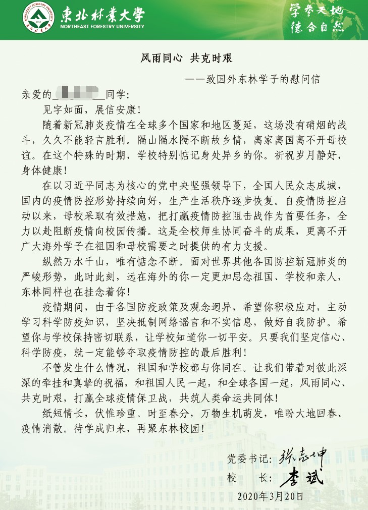 随着新型冠状病毒肺炎疫情在全球范围内蔓延和扩散,目前不在国家的同学们成为母校新的牵挂和惦念。3月22日,60名因出国交流学习等各种原因旅居或者暂时滞留在国外的东林学子的电子邮箱中,先后收到了一封名为《风雨同心 共克时艰》的慰问信。打开信件,熟悉的东林绿和温暖的问候让远在他乡的学子感动万分,纷纷通过辅导员老师表达了对母校的牵挂和感恩之情。