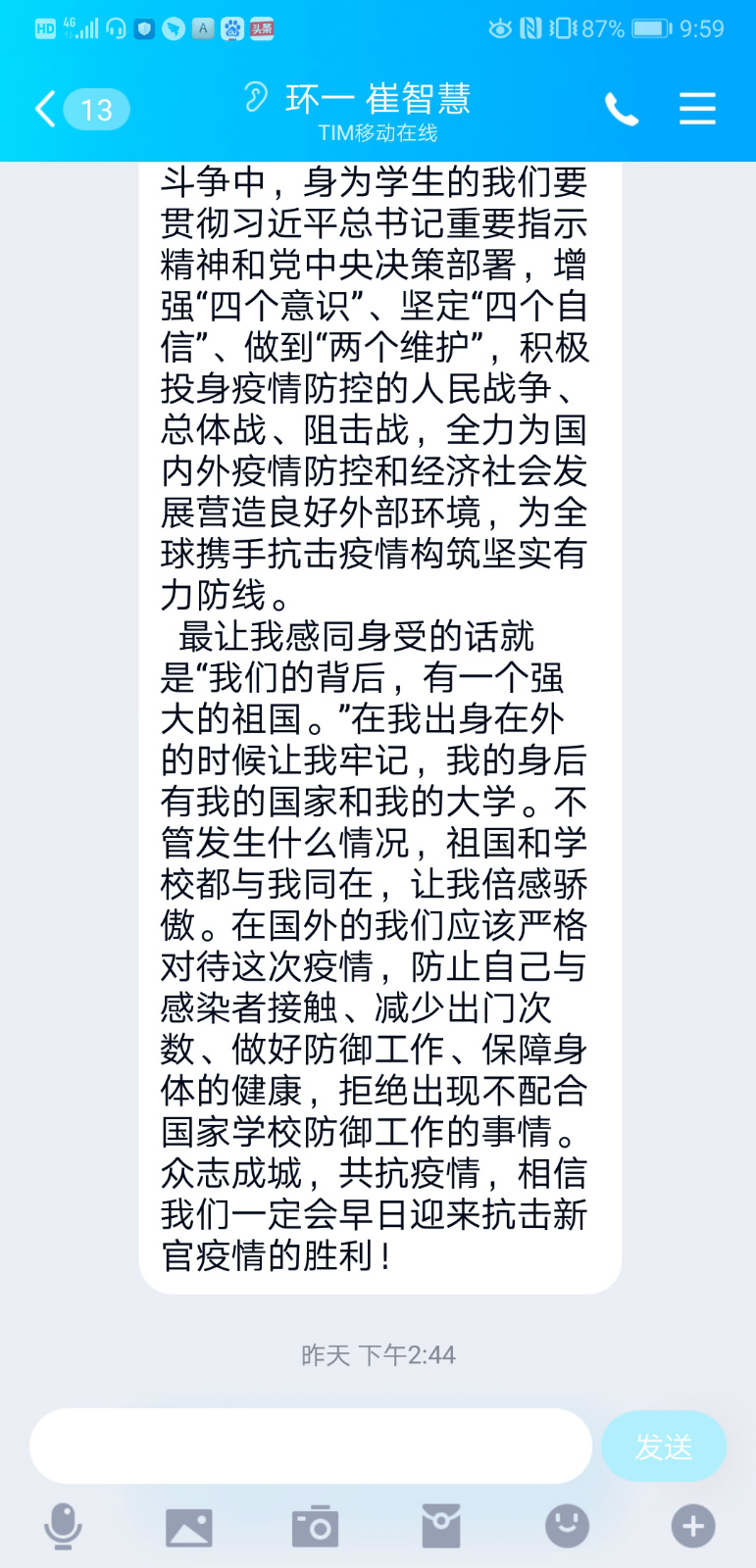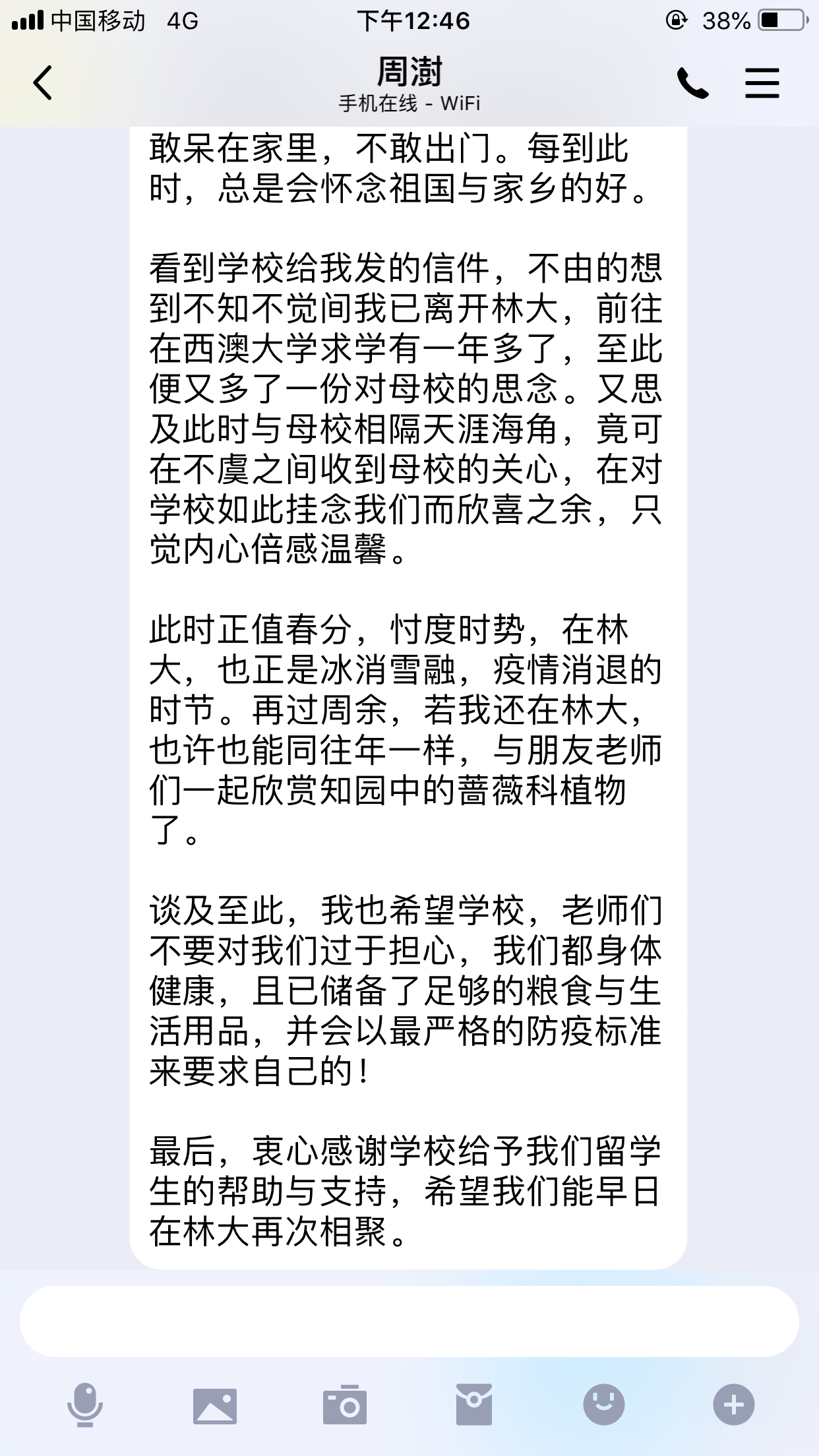 因为疫情而滞留越南的林学院森林保护专业2016级硕士研究生曾健勇在收到邮件后,第一时间向辅导员老师报平安,并简单介绍了自己在国外的学习和生活情况。他说,被人惦念的感觉真好!请学校领导和老师放心,自己会做好自我防护,并且时时汇报自己的近况。衷心希望疫情早日过去,自己能早日回到老师和同学们中间。