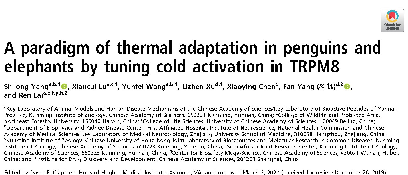 3月28日,美国科学院院刊《Proceedings of the National Academy of Sciences of the United States of America》发表了我校野生动物与自然保护地学院杨仕隆教授研究团队的题为“A paradigm of thermal adaptation in penguins and elephants by tuning cold activation in TRPM8”的研究论文(图1),该研究揭示了TRPM8对低温的感受机制以及动物对环境温度的适应机制。