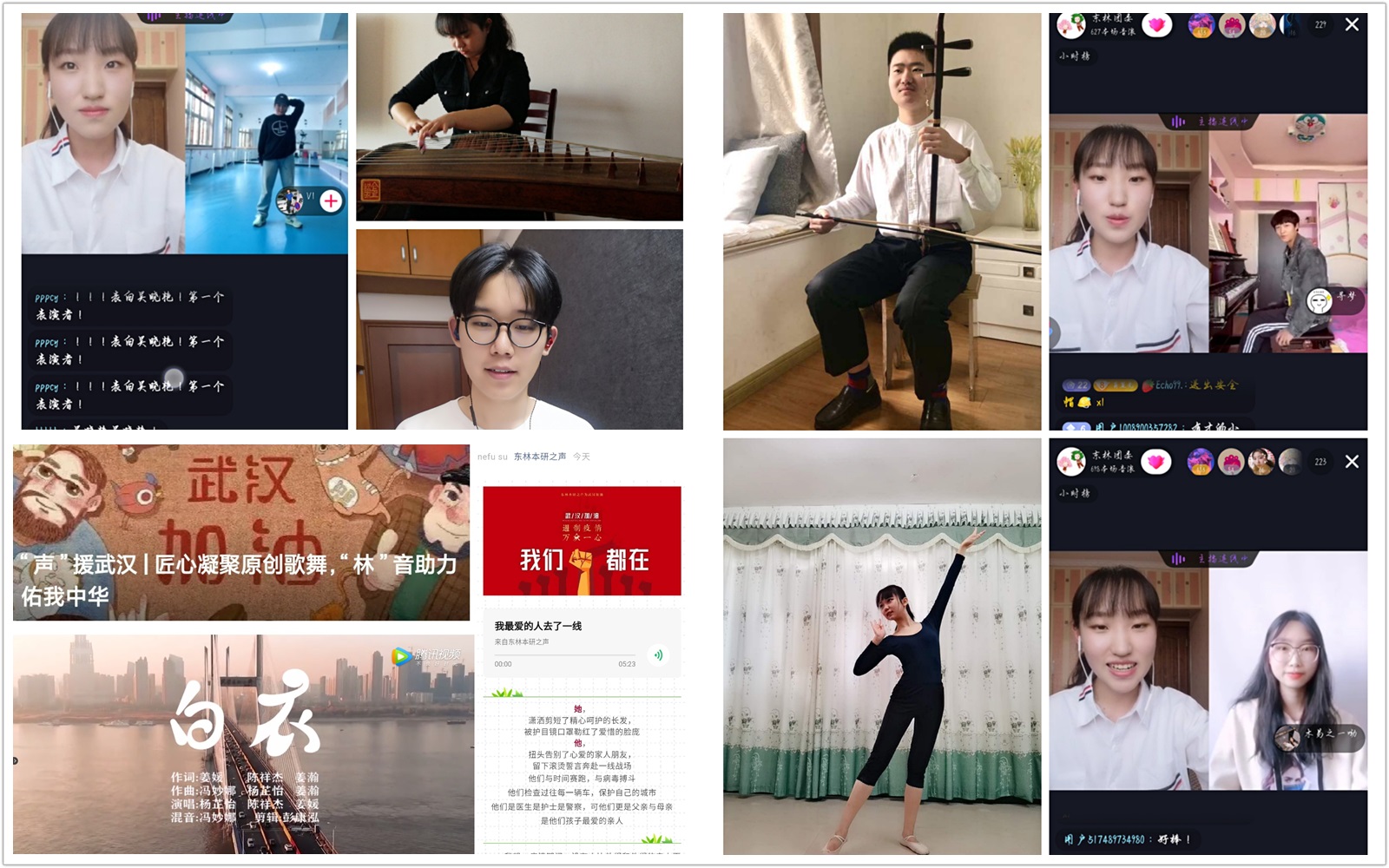 疫情发生后,东林创作了《白衣》等原创歌曲4首,同时制作了合唱《我和我的祖国》、相声《在家战疫可别闲》、器乐合奏《国家》等7个原创文艺作品。广大青年以“艺”抗“疫”,深情赞颂全国人民举国一心、共抗疫情的壮志豪情,表达团结一致、共克时艰的强大信念。