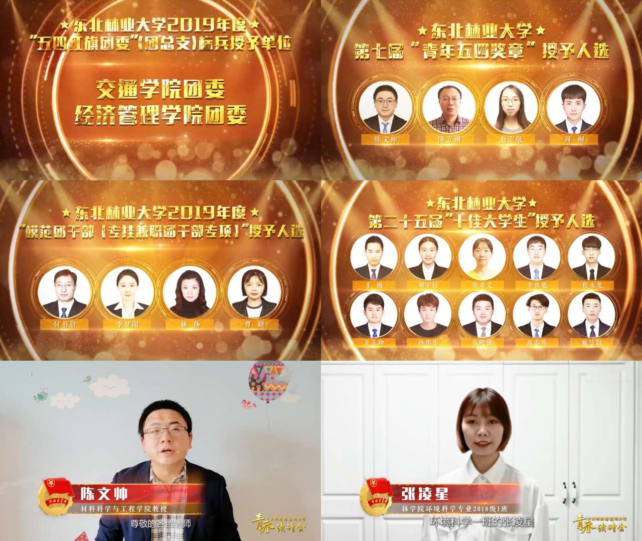 学校2019年度“五四评优”系列奖项的表彰名单也在本次读诗会上揭晓。黑龙江省第22届“青年五四奖章”和我校第七届“青年五四奖章”获得者、材料科学与工程学院教师陈文帅,我校2019年度“模范团干部”获得者、林学院2018级环境科学专业1班张凌星同学,作为受到表彰的教师和学生代表分别发言。