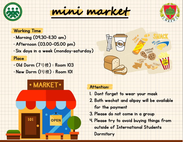 学校在国际学生公寓开设了两个临时微型超市,法立斯除了负责统筹管理两个超市的运营外,还和娜迪亚从周一至周六在自己所住的新公寓楼微型超市做4个小时的“收银员”“理货员”工作。“这两个孩子真不容易,3个月来,几乎天天看到他们,同学来买东西,他们总是热情周到,没有同学时他们就在清点商品、对账,总是在那儿忙碌着。”国际学生新公寓1号楼宿管阿姨王彦华称赞道。