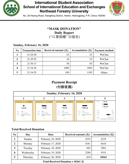 “国际航班停运了,医疗物资现在很难运到中国!”接连几个国际学生在群里说道。为了及时将爱心送到抗疫前线,法立斯建议将这笔捐款以现金的形式捐赠,得到了大家的认可,于是法立斯以全体东北林业大学国际学生的名义将全部的捐款捐献给了中国红十字会总会。