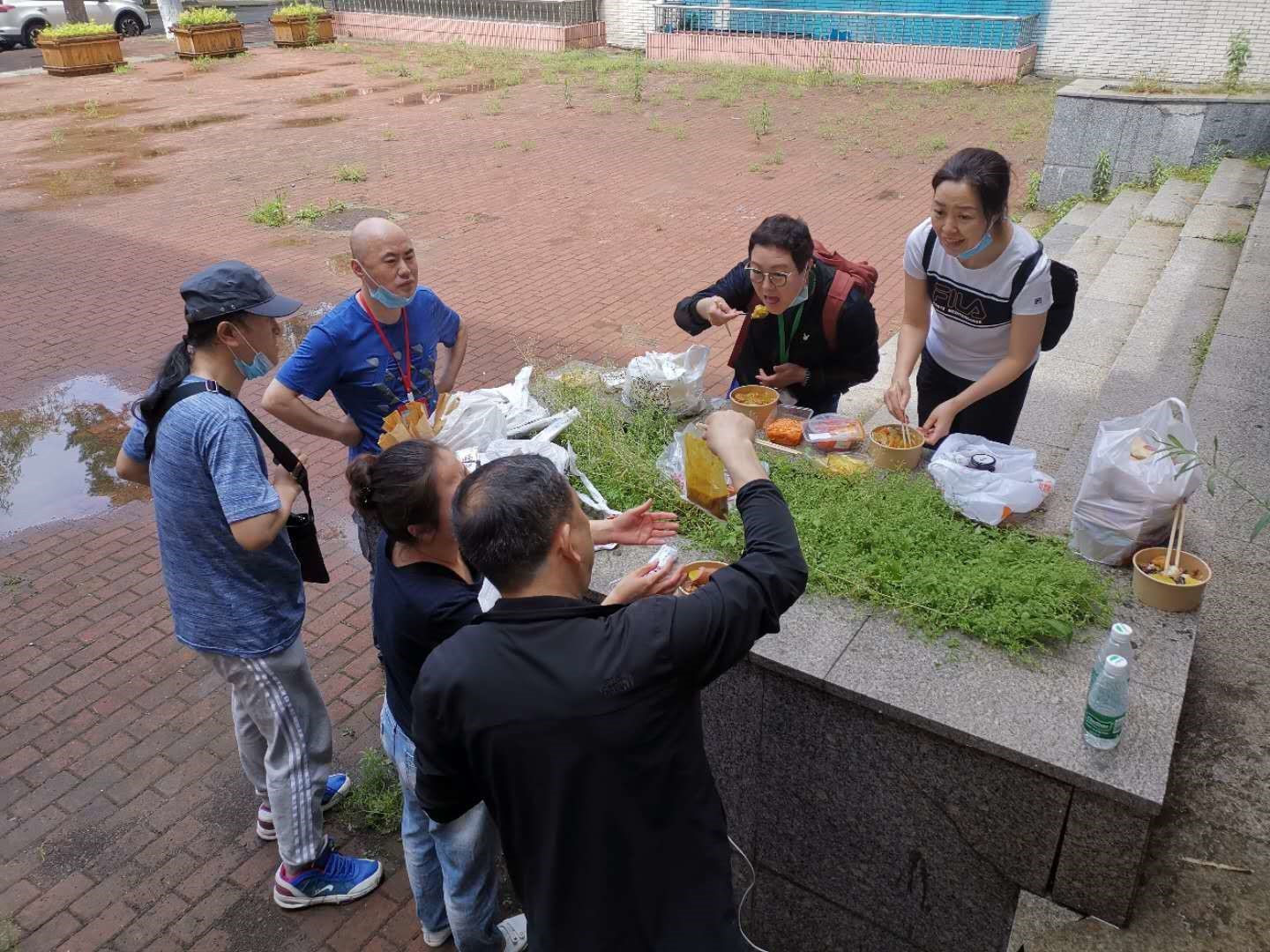 来不及吃午饭的老师在室外简单用餐