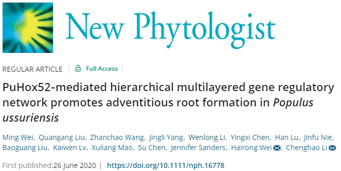 近日,林木遗传育种国家重点实验室(东北林业大学)李成浩研究组和美国密歇根理工大学卫海荣教授合作在国际植物学知名期刊New Phytologist(生物学一区,IF=7.299)在线发表了题为“PuHox52-mediated hierarchical multilayered gene regulatory network promotes adventitious root formation inPopulus ussuriensis”的研究论文。该研究阐明了大青杨PuHox52转录因子通过上调9个根发育调控基因和下调1个组蛋白去乙酰化酶基因PuHDA9的表达水平,从而调控不定根发生的分子机制。