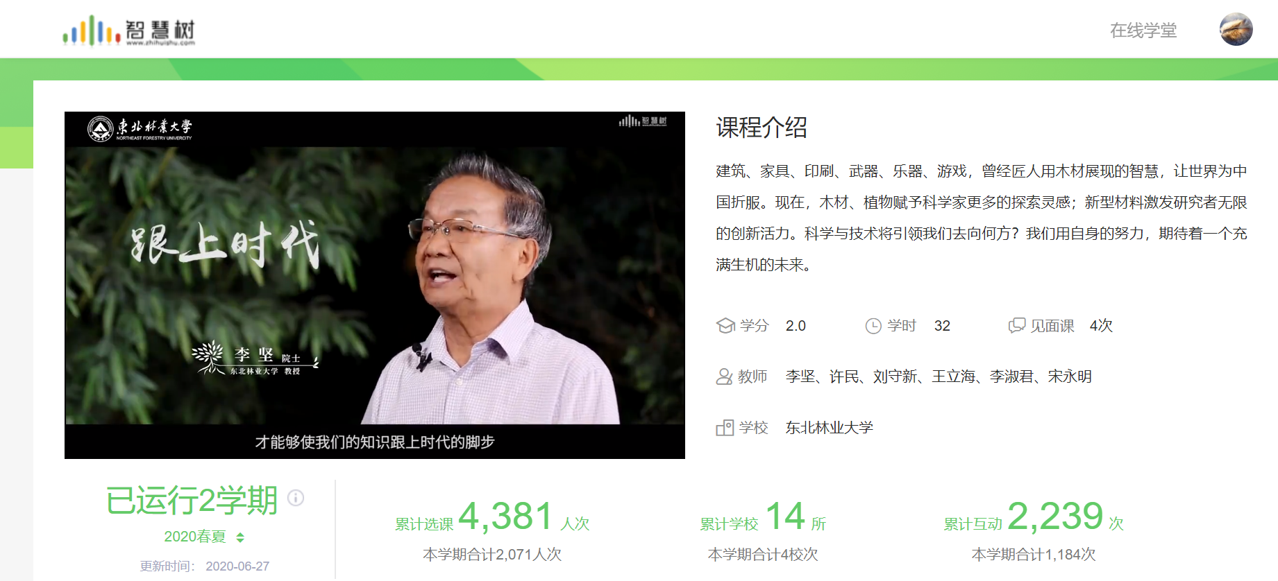 有了充分全面的准备,木材科学与技术党支部教师们在后续的教学工作中全力以赴、各显其能,收获了同学们良好的反馈。本学期,李坚院士主讲的线上慕课《木材·人类·环境》和《仿生自然 绿色发展——与环境相关的木材属性》刚刚上线,就有过万名同学选修学习,此外,支部党员教师1人被评为东北林业大学本科在线教学优秀教师,1门课程被评为东北林业大学“课程思政”示范课程,1门课程的教学案例被推荐至黑龙江省普通高等学校在线教学工作简报。