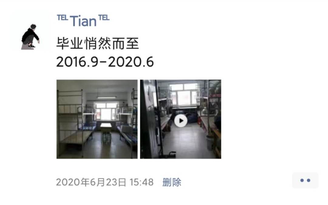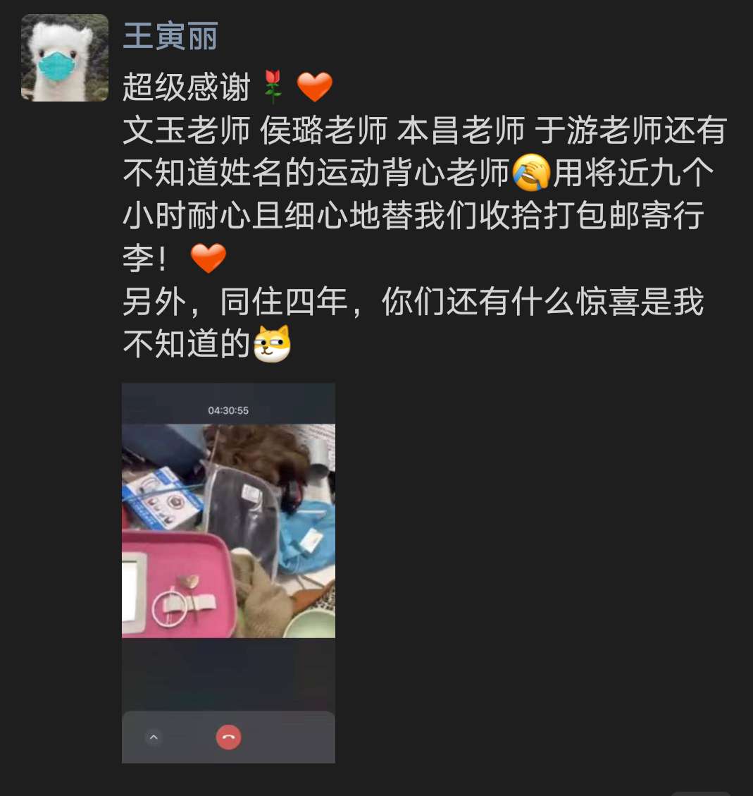 毕业生滕如说:“在这个特殊的毕业季,我们无法回到学校,也无法打包、邮寄自己的行李。要感谢每位老师,不辞辛苦地满足我们的需求。尤其我的杂物很多,老师也都耐心地和我视频确认,一一帮我打包好。在哈尔滨开满丁香花的季节,我们本应穿着学士服和老师们拍照留念,吃一顿散伙饭。但分别是为了下一次再见,我相信,这些遗憾终将会被弥补。最后,祝愿我的母校和学院越来越好!”