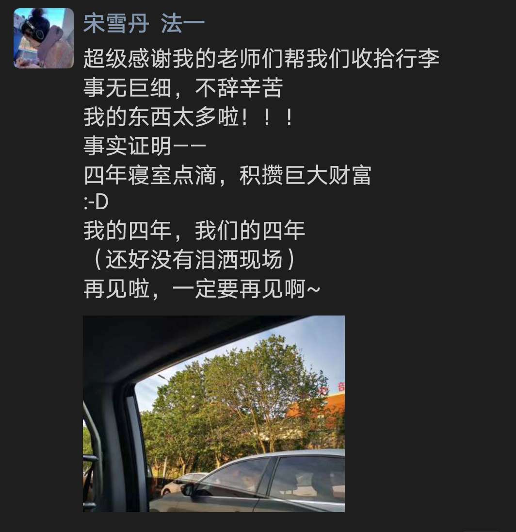 毕业生张雅琪说:“今年虽然没有毕业典礼,但却有着让我一生难忘的‘云’毕业典礼和温情毕业‘寄’。虽然没能返回学校,但却感受到了老师们最贴心的呵护。学院领导们为了我们的毕业事宜,一次次的开会,一次次的协商。作为文法人,我深切感受到了学校学院对每一位学子的关心和爱护,学院竭尽全力的满足着我们毕业生邮寄行李和毕业物品的需求,各位老师和领导每一次仔细地询问‘孩子,要么?’都令我感动。学校和学院的教导和帮助,学生将终生铭记。身为东林学子,是我一生的荣幸和幸福。此行难忘,此情永记。”