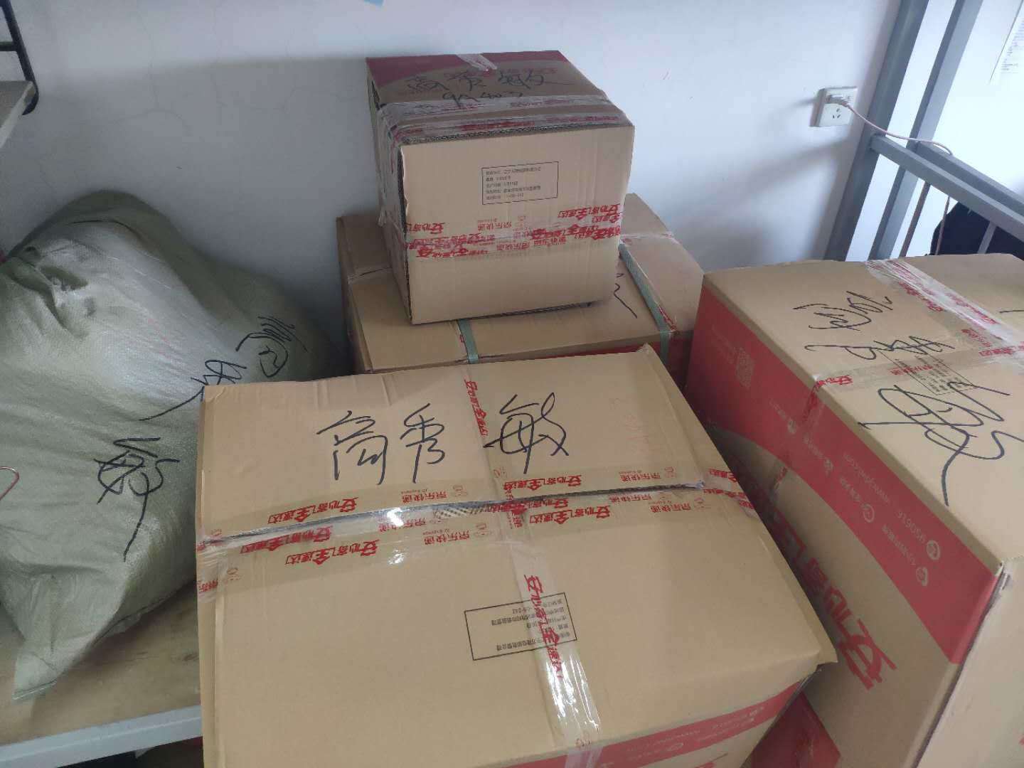 同学们的行李已经打包好,整整齐齐地放在一起,准备邮寄。