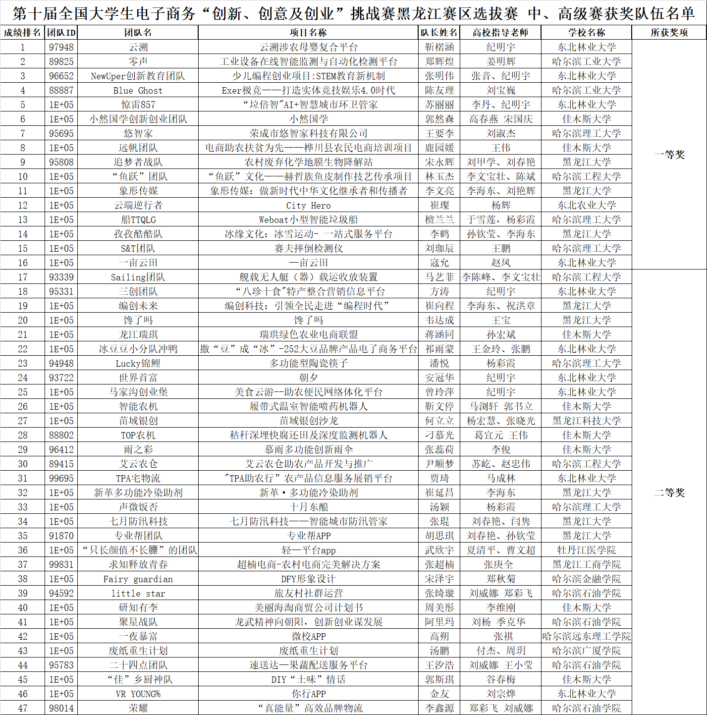 附件1:第十届全国大学生电子商务“创新、创意及创业”挑战赛黑龙江赛区选拔赛 中、高级赛获奖队伍名单