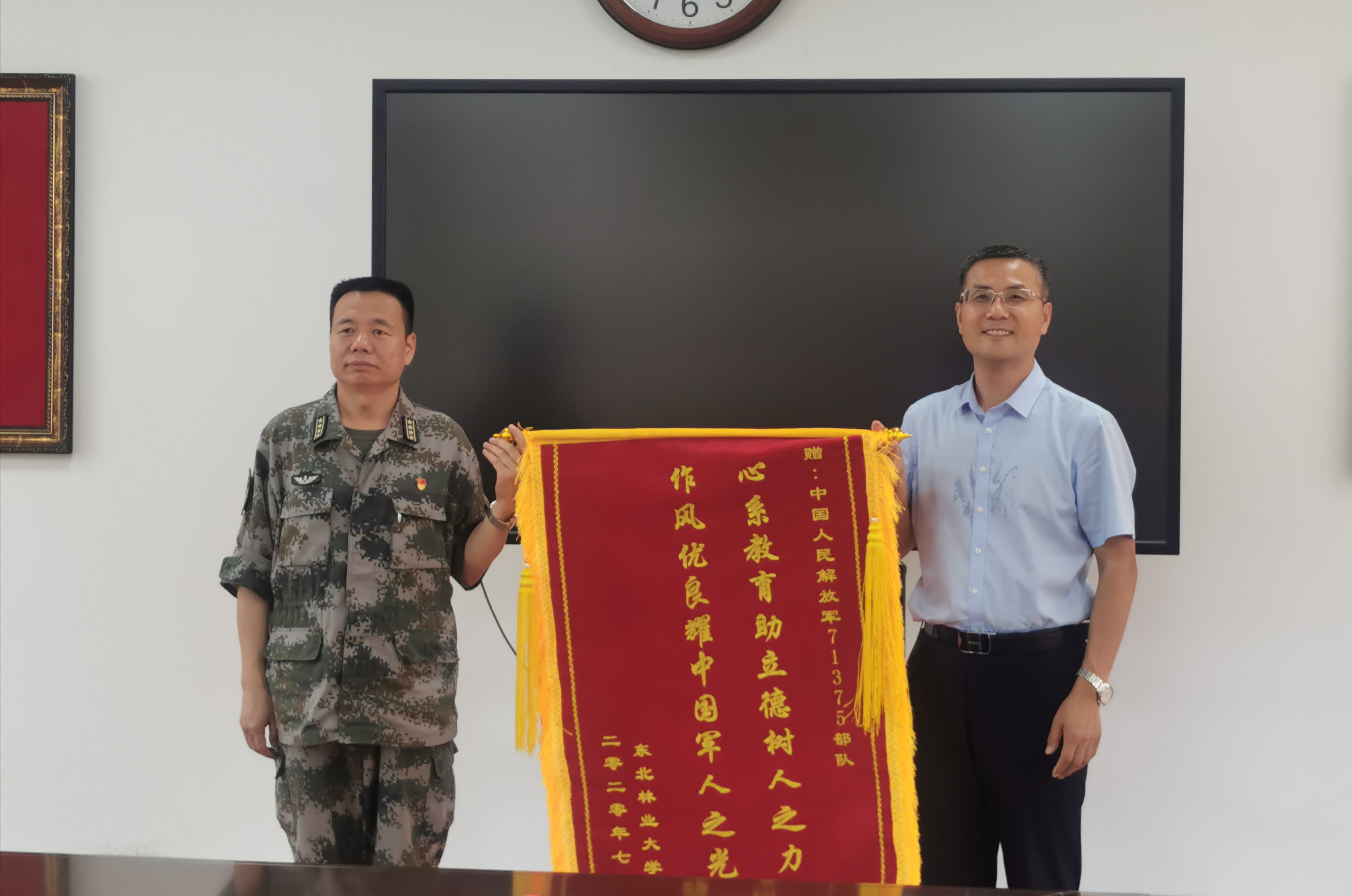 7月24日上午,校党委常委、副校长雒文虎带领学校学工武装部相关人员到中国人民解放军71375部队开展慰问活动,71375部队政委张为民大校参加慰问活动。雒文虎副校长代表学校向71375部队全体指战员致以节日的祝福和亲切的慰问。他表示,71375部队和东北林业大学是军校共建单位,有着深厚的感情和良好的合作,71375部队在国防教育、学生军训、军校共建等方面均给予了学校大力的支持和帮助,接下来,学校会继续做好双拥共建工作,在完善部队营区绿化建设、提升部队文化内涵建设等方面,结合学校特色,有针对性地开展相关工作。71375部队政委张为民大校代表部队向学校表达了感谢,他表示自换防至哈尔滨后,学校领导第一时间到部队对接共建,与东北林业大学结下深厚友谊。东北林业大学办学有特色、有历史,科研水平高、学生素质好,在行业内独树一帜,给部队的印象也尤为深刻。同时,张为民大校也代表71375部队对东北林业大学一直以来的支持表示感谢,也希望参与更多的国防教育和人才培养工作,一起为国家培养国防意识高、综合素质好的当代大学生。