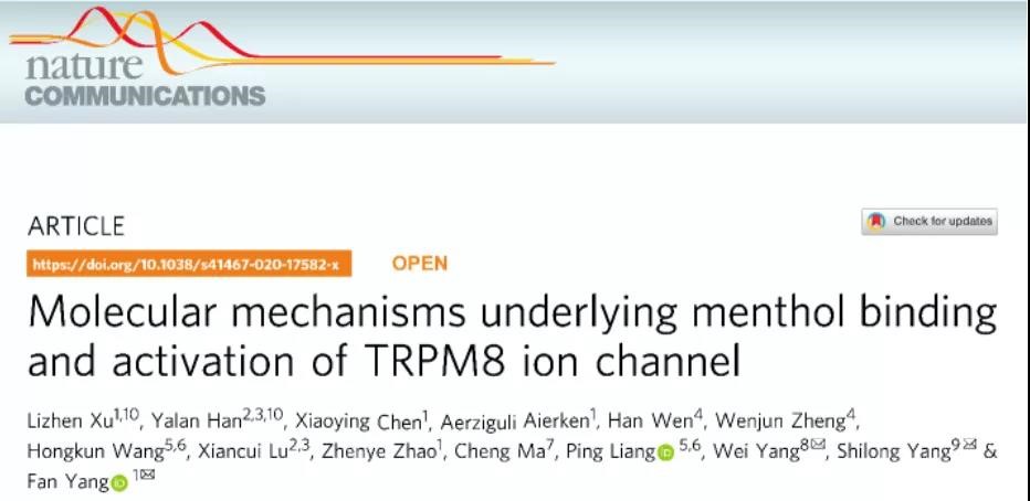 2020年7月29日,浙江大学基础医学院生物物理学系的杨帆课题组、杨巍课题组和东北林业大学的杨仕隆课题组在《Nature Communications》上发表研究论文“Molecular mechanisms underlying menthol binding and activation of TRPM8 ion channel”,探讨了薄荷醇结合并激活TRPM8受体的结构机理。