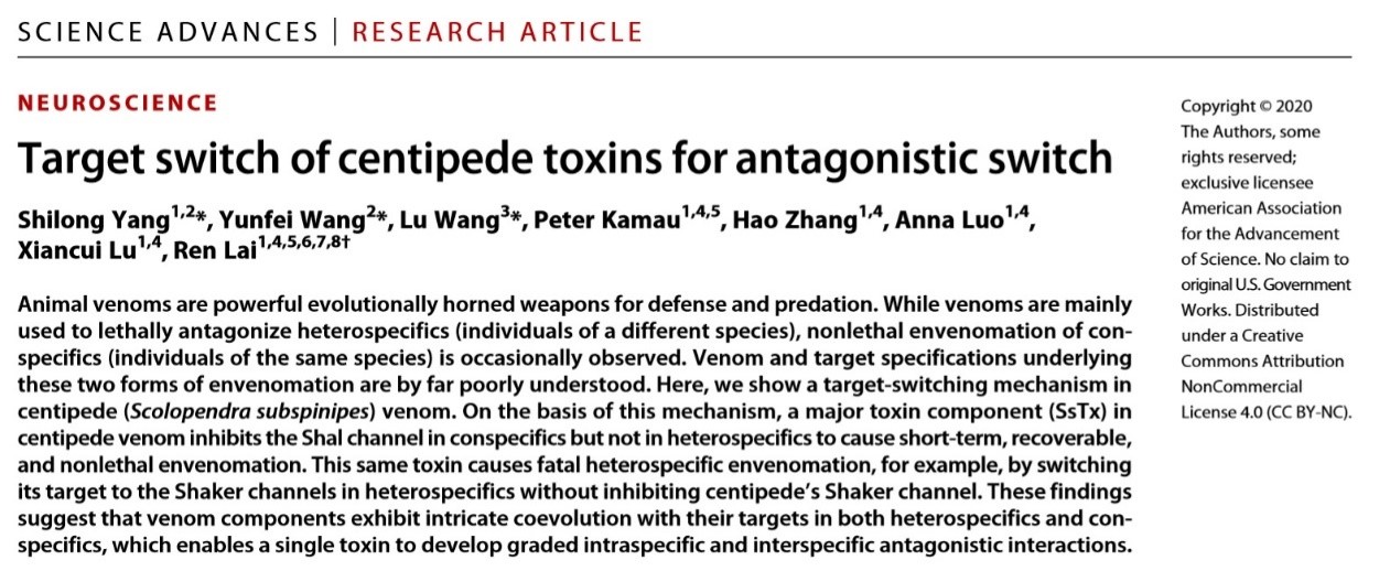 2020年8月8日,中国科学院昆明动物研究所赖仞课题组和东北林业大学的杨仕隆课题组在《Science Advances》上发表研究论文“Target switch of centipede toxins for antagonistic switch”,揭示了产毒动物高效应对种间和种内竞争的“靶点切换机制”。