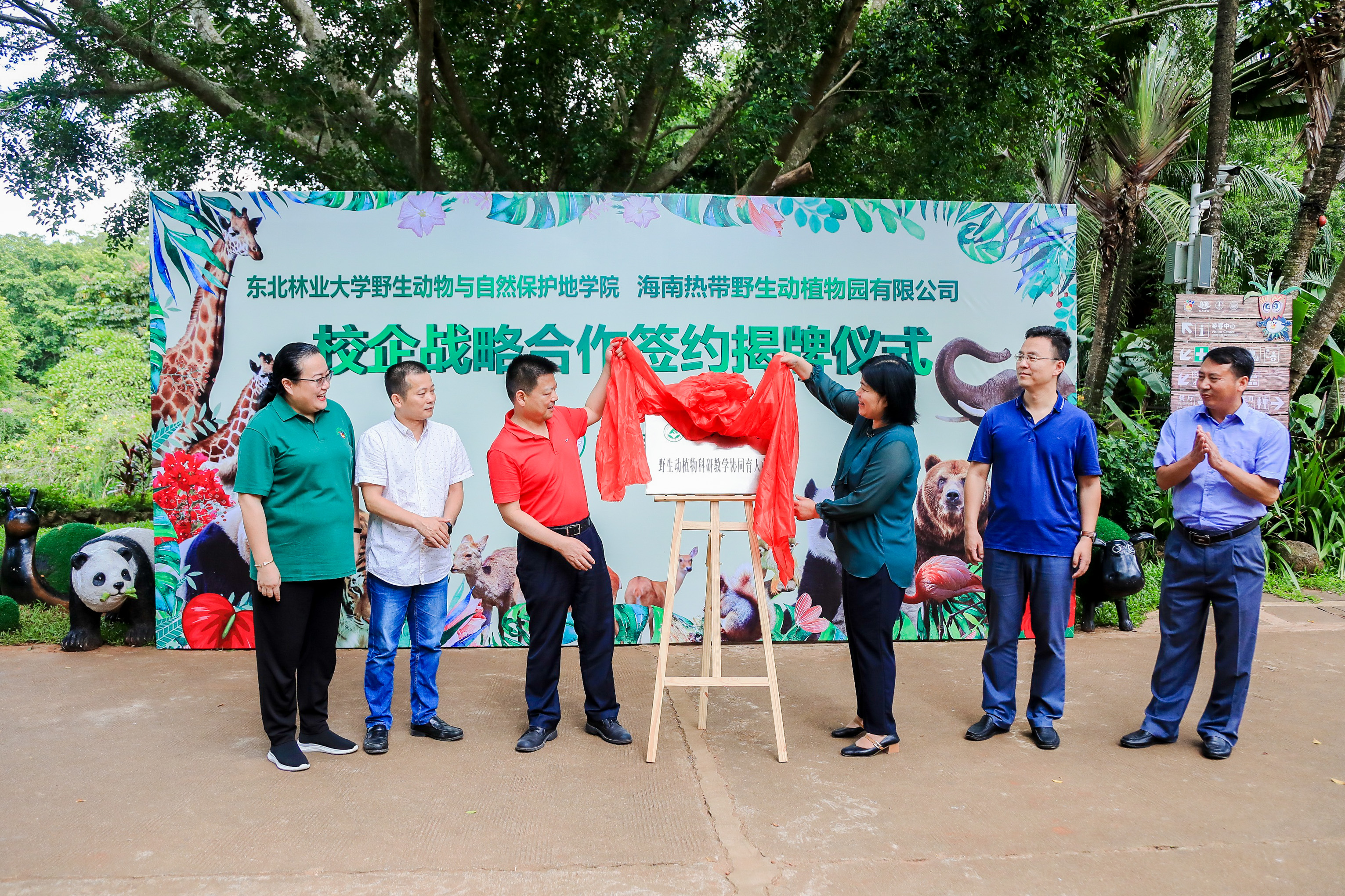 海南省林业局夏斐书记、海南省教育厅高等教育处王飞处长、我校野生动物与自然保护地学院邹红菲院长、吴庆禹书记、海南大学林学院宋希强院长与海南热带野生动植物园尚晓董事长共同为“东北林业大学野生动植物科研教学协同育人中心”揭牌。