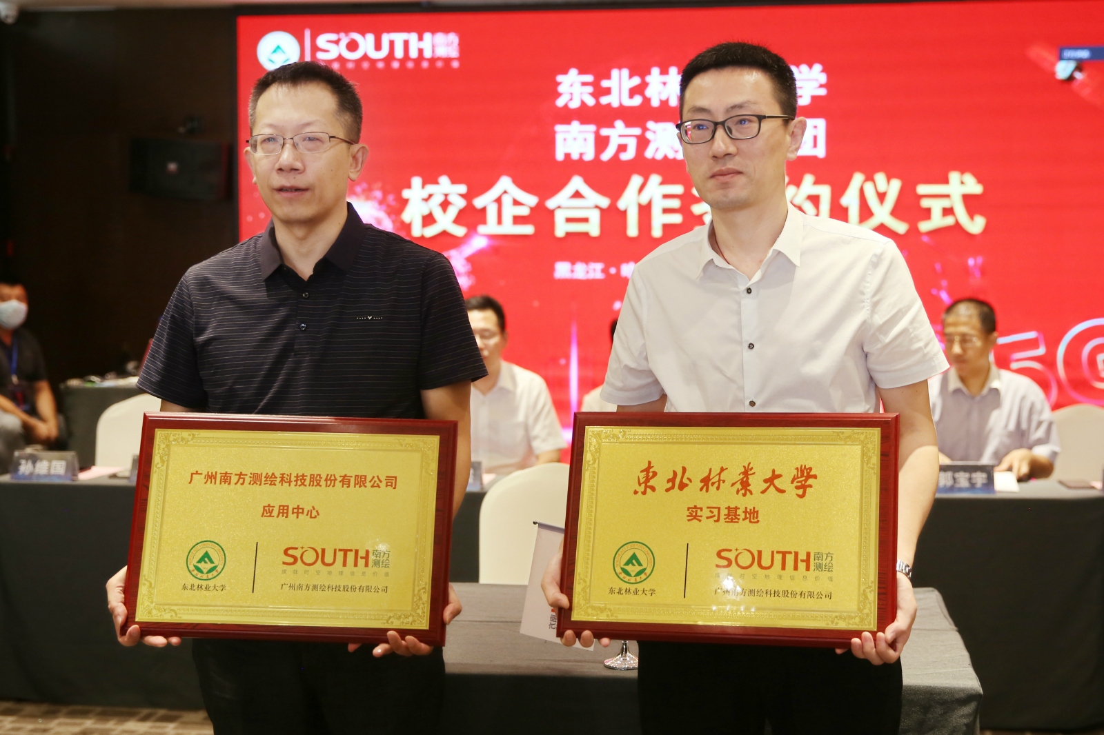 最后,东北林业大学副校长宋文龙与南方测绘集团副总经理郭宝宇进行校企合作签约仪式。东北林业大学土木工程学院副院长程东辉与南方测绘集团黑龙江分公司总经理朱洪成进行实习基地授牌仪式。