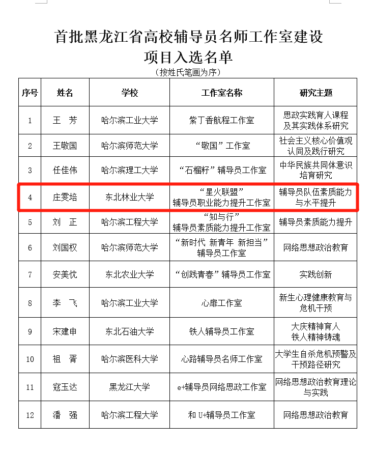 “黑龙江省高校辅导员名师工作室”由省委教育工委、教育厅组织申报和评选。旨在发挥榜样辅导员的辐射和带动效应,为辅导员队伍职业化、专业化发展搭建示范引领平台。工作室采用主持人负责制,在两年的建设周期内,以项目化运营,团队型攻关的方式开展相关理论与实践研究。