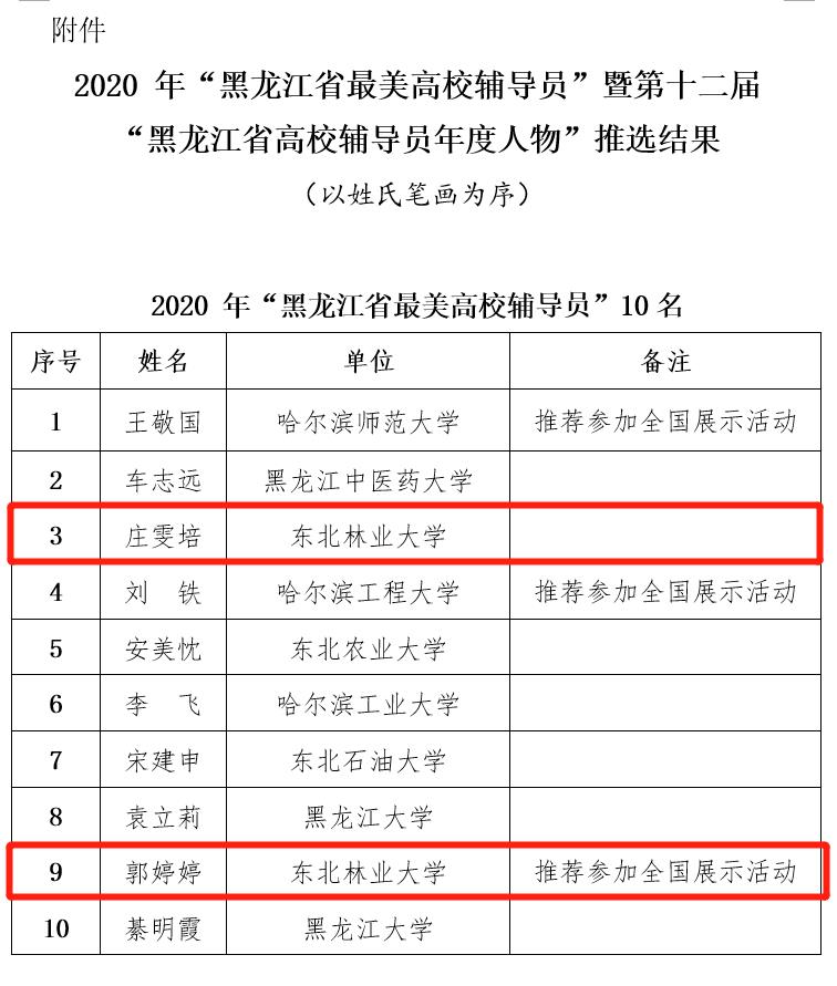 日前,我校辅导员队伍建设再结硕果,信息与计算机工程学院党委副书记、副院长庄雯培,生命科学学院副处级辅导员郭婷婷被评为“黑龙江省最美高校辅导员”,经济管理学院团委书记曹颖获评第十二届黑龙江省高校辅导员年度人物。其中,郭婷婷将作为黑龙江省推荐人选参评本年度全国最美高校辅导员。早些时候公布的“2020年黑龙江高校辅导员名师工作室”立项公示中,庄雯培申报的“星火联盟”辅导员工作室从全省各高校20名入围候选人中脱颖而出,获得首批立项资格。