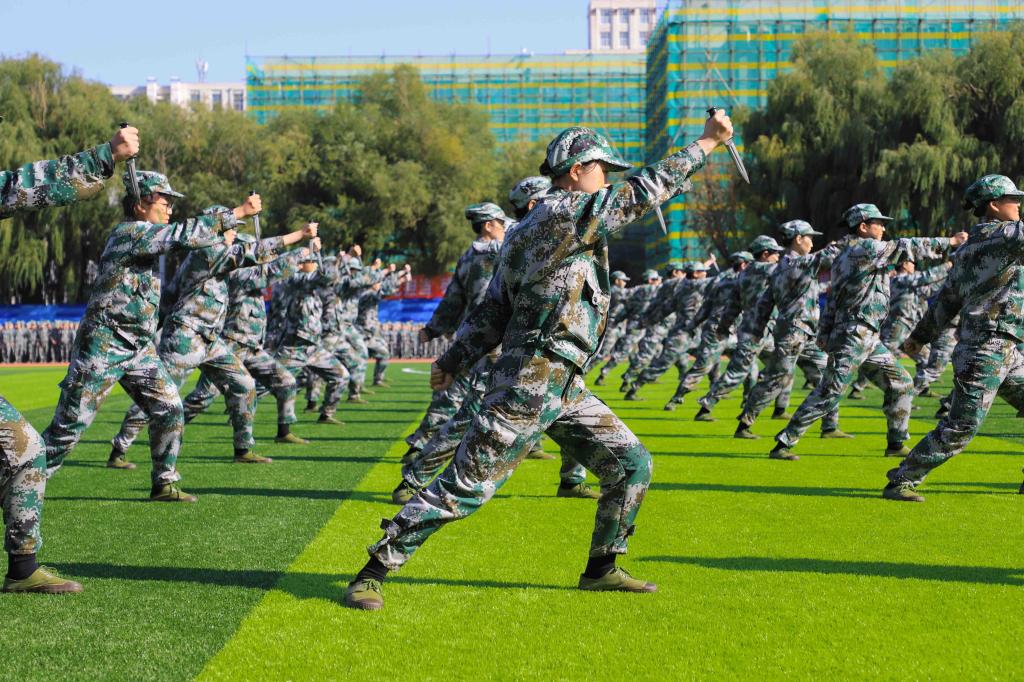 大会在雄壮的国歌声中拉开序幕。首先进行的是两个训练科目的成果展示。第一个出场的是由经济管理学院带来的军体拳表演,他们出拳干净利落,动作准确到位,展现出良好的军事素养和协作意识。表演结尾,五星红旗漫卷而过,在阳光下熠熠生辉。紧随其后的是由外国语学院女子方队组成的捕俘刀表演,英姿飒爽的她们充分展现了汗水铸就的训练成果,引来场内阵阵掌声。