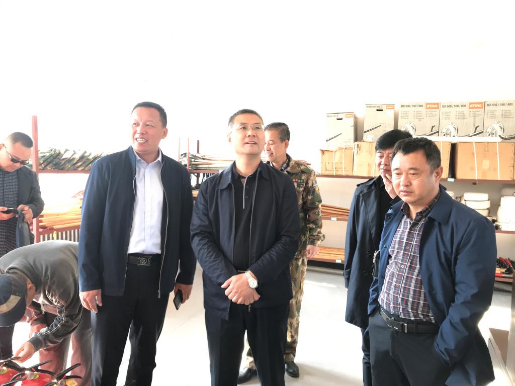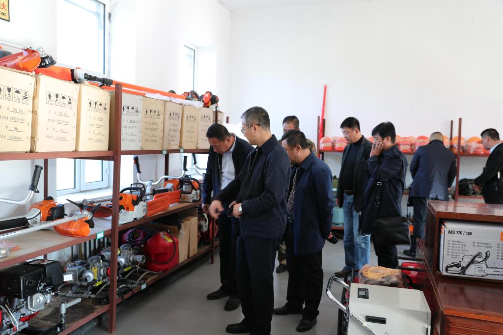 在林场防火物资储备库,检查组一行实地查看了林场防火物资储备及管理情况,看到库房干净整洁,机具设备摆放整齐并且标明采购日期及数量,雒文虎副校长称赞林场防火物资管理水平较高,同时表示新机具、新设备只有真操实练才能形成队伍战斗力,要求林场加强队伍训练。