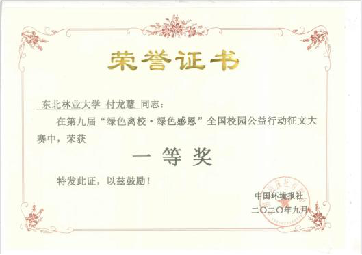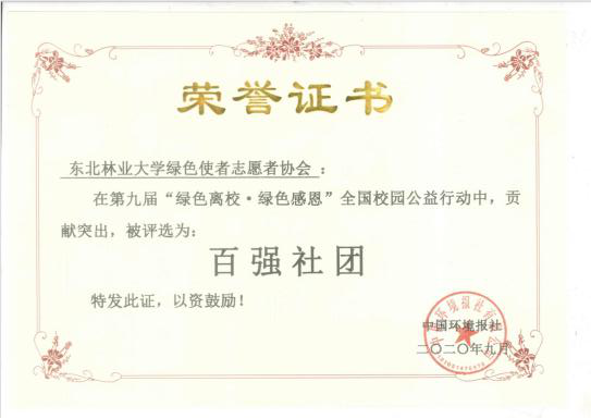 为切实贯彻习近平总书记生态文明思想和党的十九大、十九届三中、四中全会生态建设决策,推进落实学校第十三次党代会精神,宣传生态文明理念,9月15日,东北林业大学绿色使者志愿者协会参加了由中国环境报社、中国环保网、物物福公益联合发起主办的第九届“绿色离校·绿色感恩”全国校园公益行动评选活动,并成为黑龙江省唯一一个获得“百强社团”荣誉称号的协会。