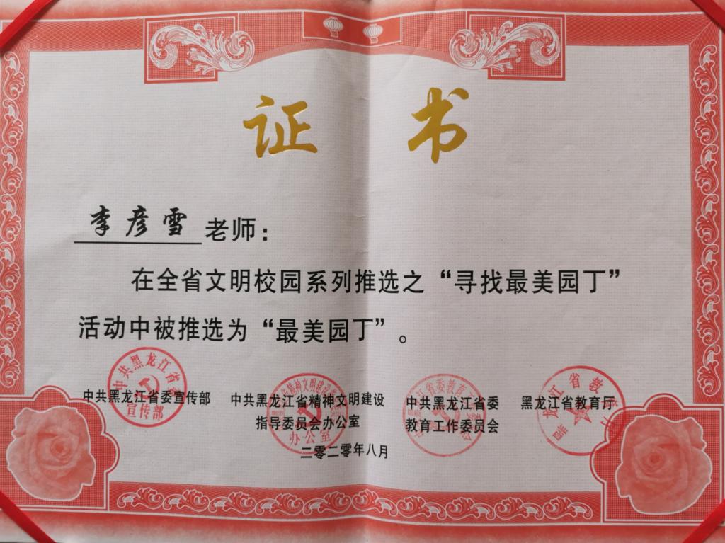 近日,在省委宣传部、省精神文明办、省委教育工作委员会和省教育厅联合开展的黑龙江省“文明校园”系列推选中,我校园林学院李彦雪获黑龙江省“最美园丁”荣誉称号。