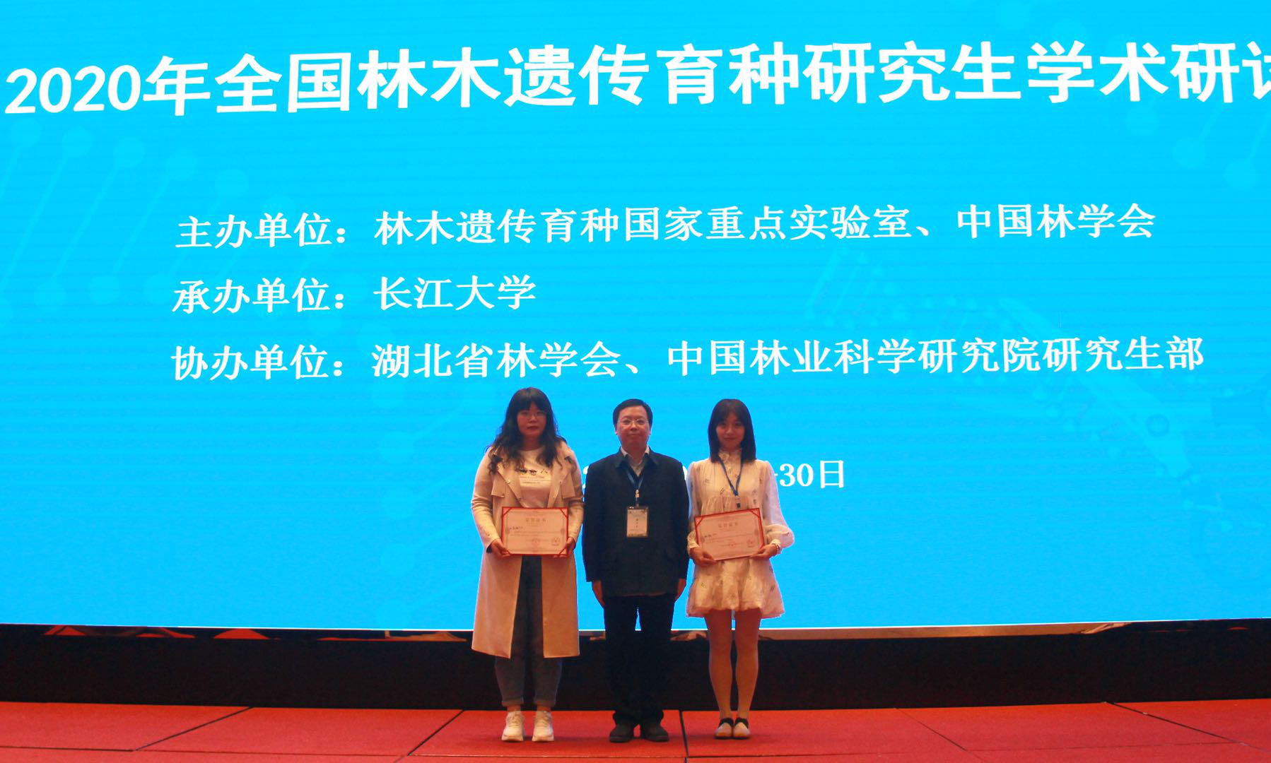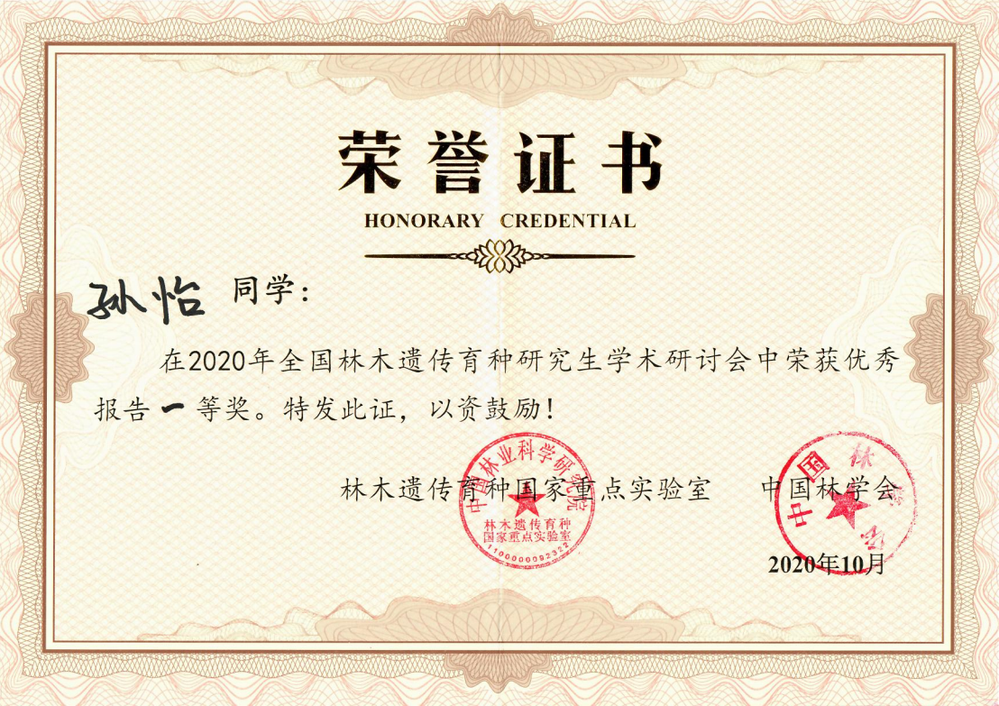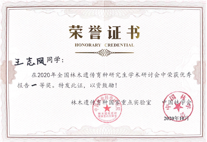 10月27日至30日,2020年全国林木遗传育种研究生学术论坛在湖北省荆州市召开。我校林木遗传育种国家重点实验室主任姜立泉教授及李伟教授指导的博士研究生王志凤和孙怡双双斩获研讨会报告一等奖。