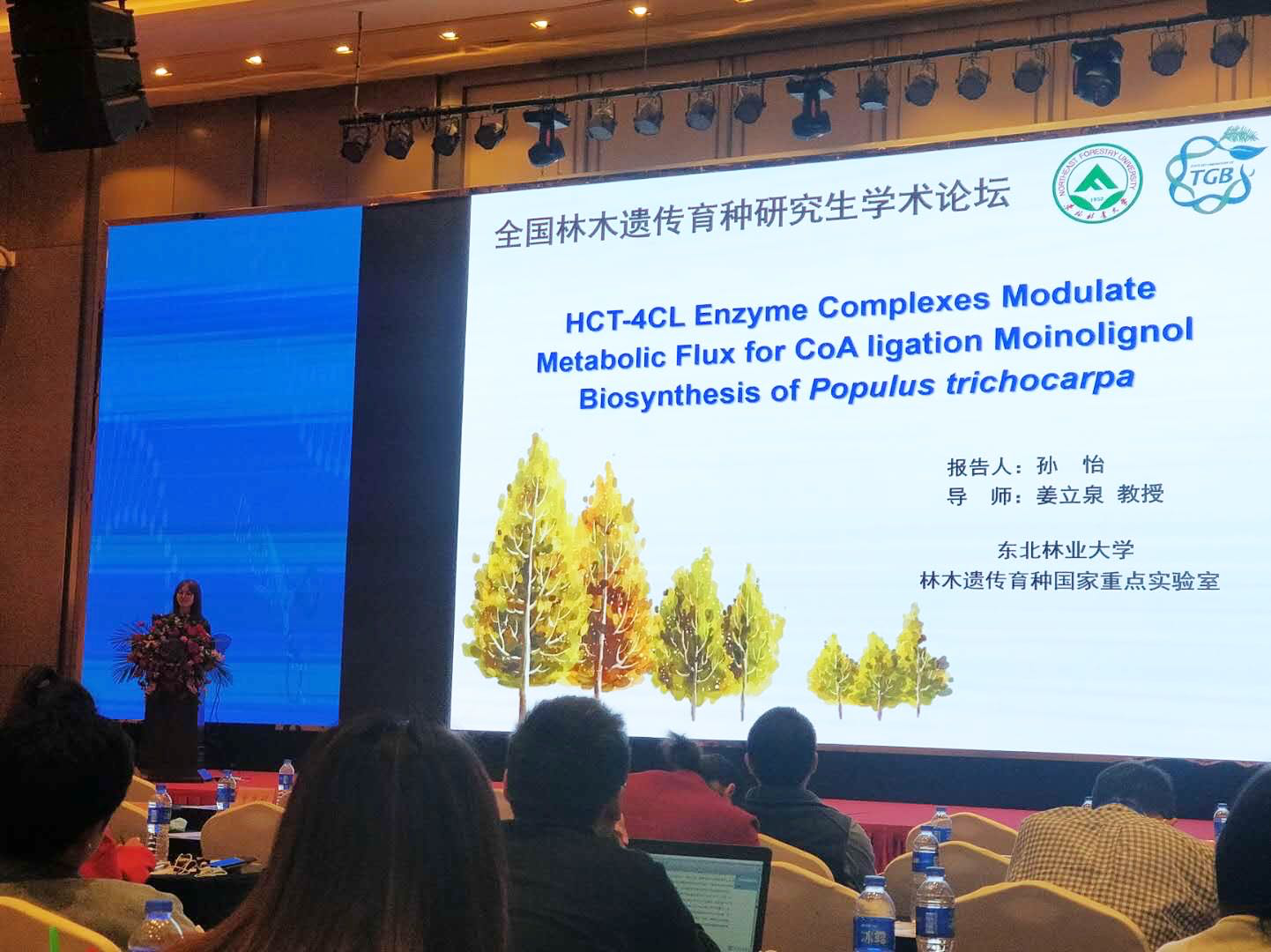 我校博士研究生王志凤和孙怡分别以《MYB161转录因子介导SND1家族基因的反馈调节参与木材形成》和《毛果杨木质素单体合成途径中4-香豆酸辅酶A连接酶(4CL)与莽草酸羟基肉桂酰转移酶(HCT)复合体解析》为题,揭示木质素单体合成的机理,为利用分子育种技术进行林木材性改良提供路径。两名博士生的报告内容新颖,注重科研创新,在众多现场报告当中脱颖而出,获得评审专家一致好评。王志凤和孙怡在众多高校的林业研究生中包揽论坛优秀报告一等奖,代表我校在林木分子生物学研究方向的科研水平处于国内引领地位,实验室将以此为基础,向国际学术前沿不断奋进。