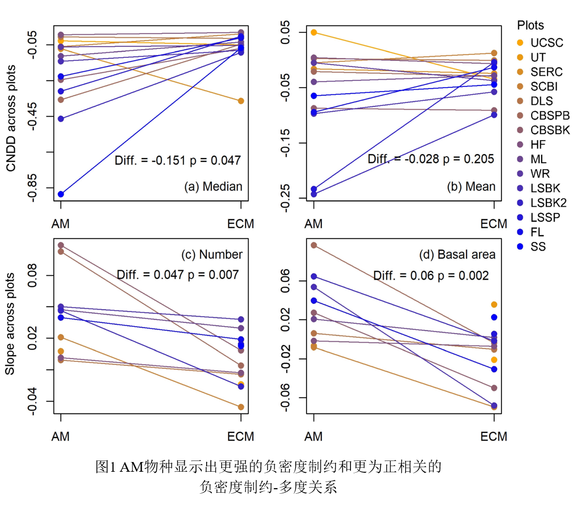 森林群落的生物多样性在不同区域之间存在差异,是什么机制驱动着区域间的差异一直以来是生态学研究的核心问题和难点。阐明其机制不仅有利于理解森林生态系统功能,还有助于预测气候变化如何影响生物多样性的丧失。由此,生态学家提出了多种假说来解释生物多样性的维持,其中同种负密度制约效应就是被广泛接受的机制之一。植物同种负密度制约效应是常见的生态学现象,即植物在其同种聚集的地方(更多的病原菌、捕食者等)有更高的死亡率,同种的死亡可以腾出更多的空间和资源给其他物种。因此,负密度制约效应可以防止某一个物种完全占据所有的空间从而提高不同物种之间的共存。然而,不同物种可能显示出不同的密度制约效应强度。当某一物种密度制约较弱时,即使在该物种聚集的地方也有较高的存活率,因此该物种的多度会很高,从而排斥其他物种、降低群落多样性。该研究结合我校凉水林场的森林动态监测样地内的植物死亡动态数据和我国东北及美国共15个温带森林动态监测样地内物种的分布数据发现,外生菌根(ECM)植物由于受到菌根真菌的保护程度比内生菌根(AM)植物更高,因此显示出更弱的负密度制约效应。进一步分析发现,由于ECM植物密度制约更弱,ECM植物往往比AM植物具有更高的多度,ECM植物的比重升高会降低群落内的植物多样性。